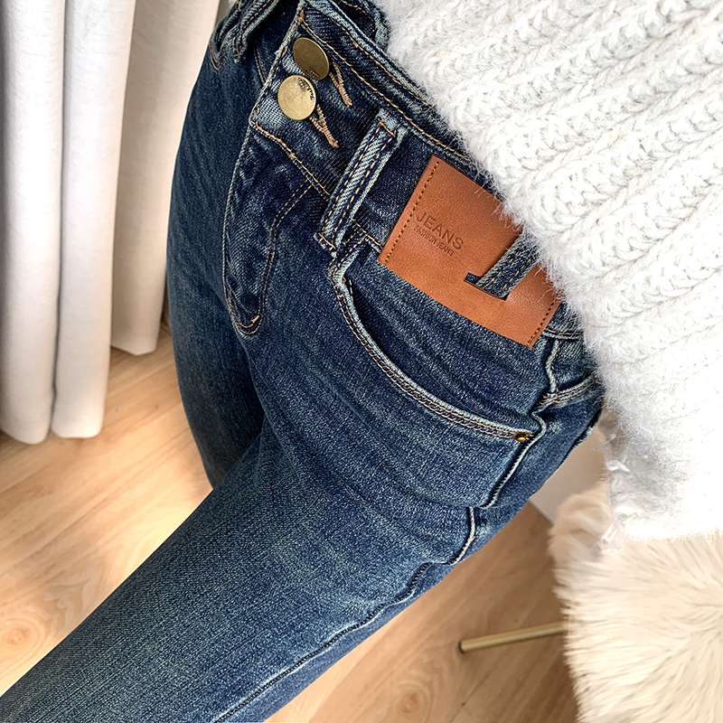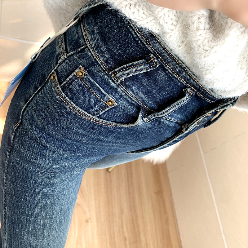 显瘦神裤!深蓝色高腰双排扣收腹牛仔裤女弹力紧身提臀小脚裤秋冬