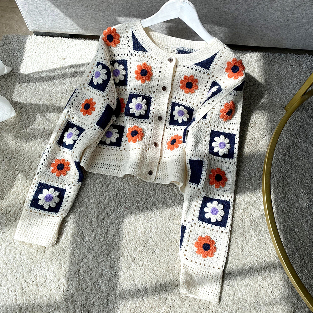 复古文艺钩花绣花镂空森系外搭拼色立体轻薄长袖针织开衫外套女