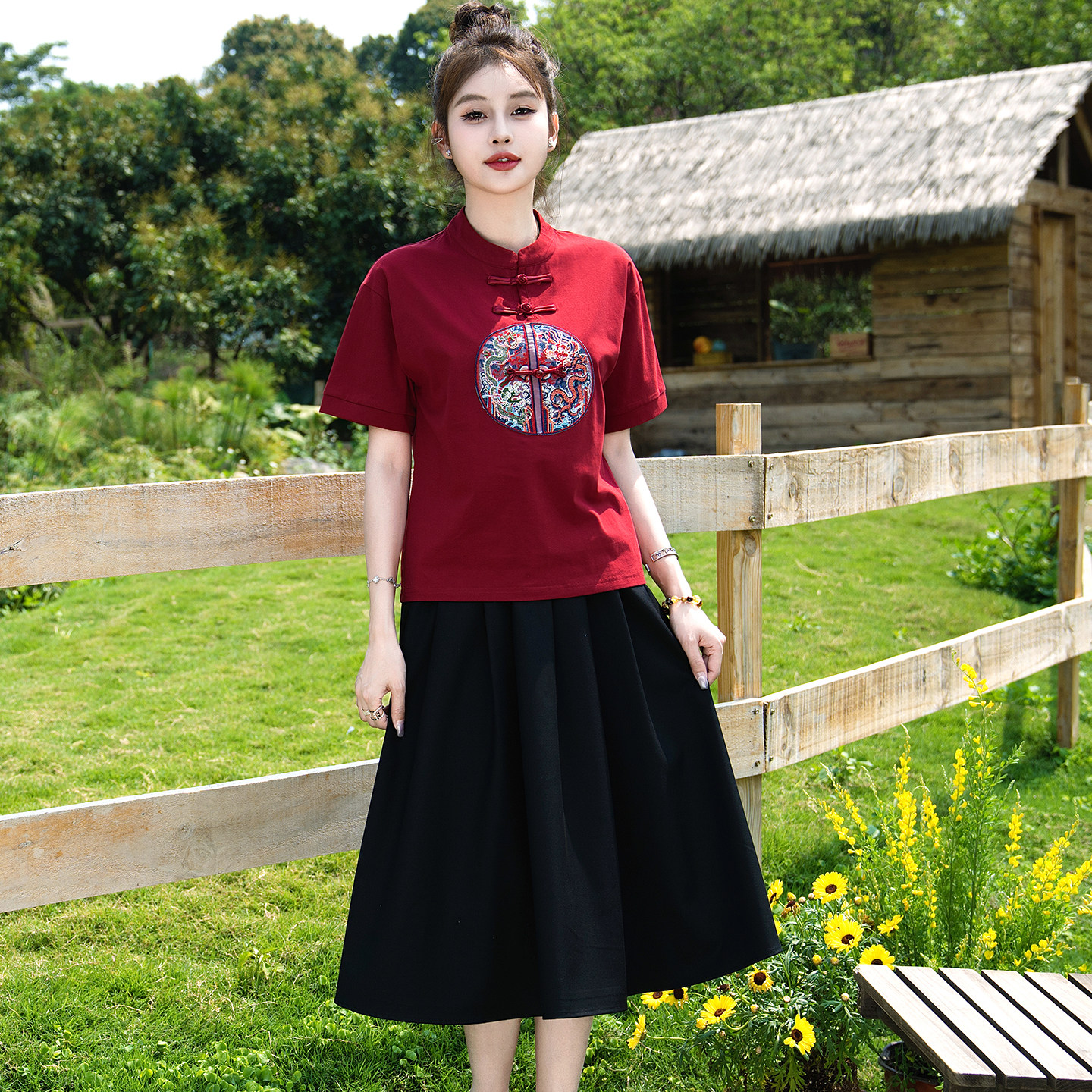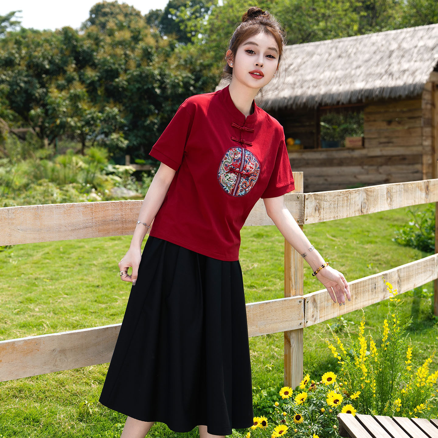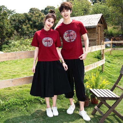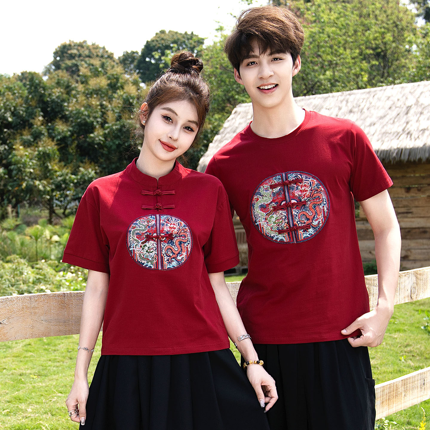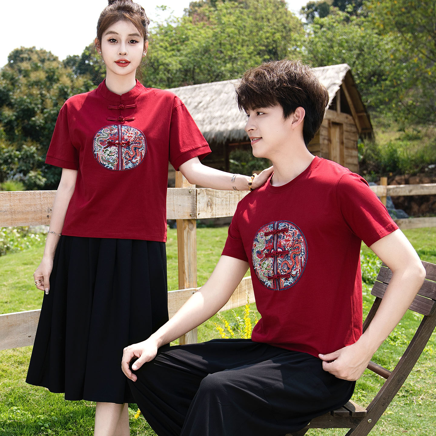 新中式情侣装夏装国风穿搭高级感短袖新年过年红色T恤家庭装衣服