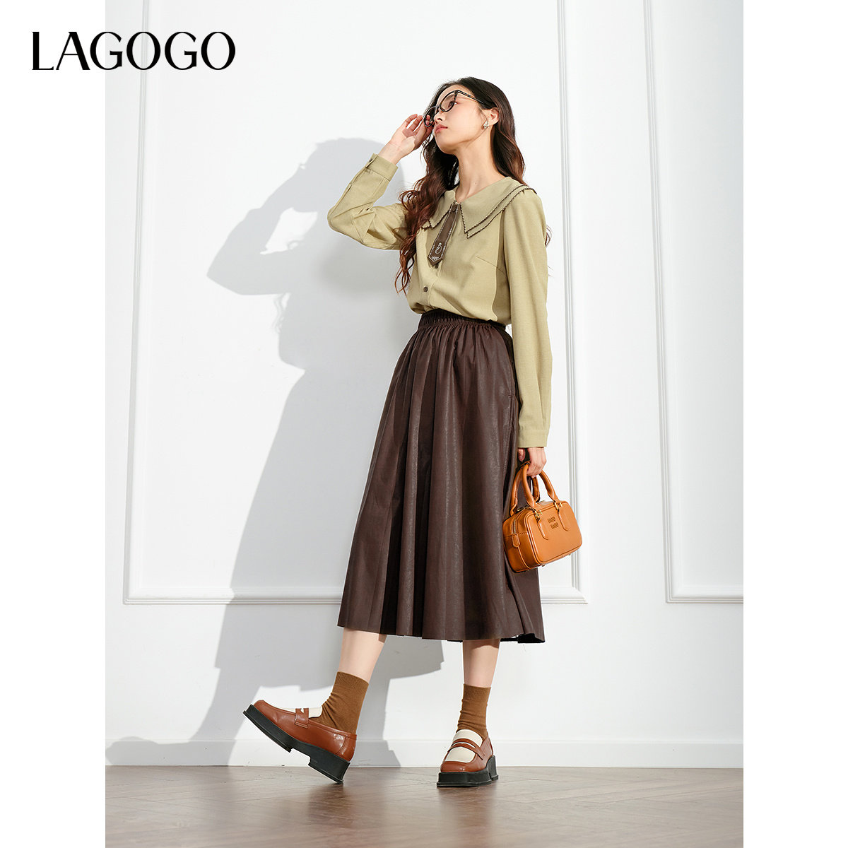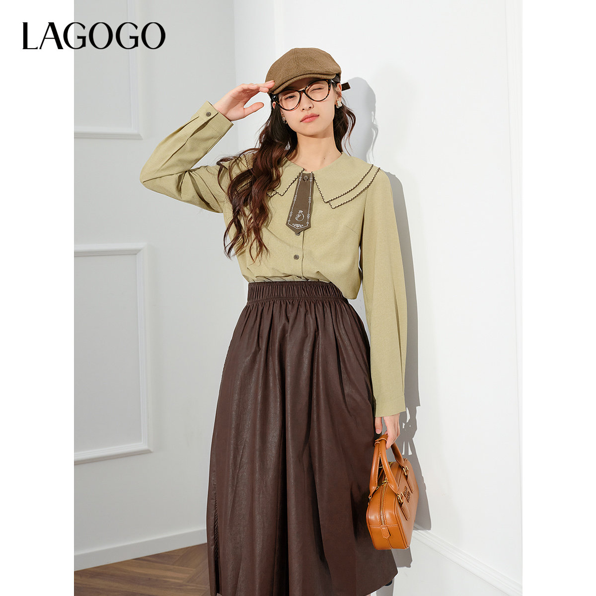 LAGOGO娃娃领刺绣领带学院风衬衫