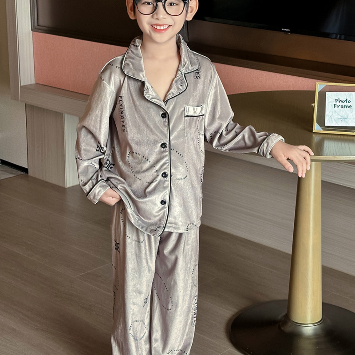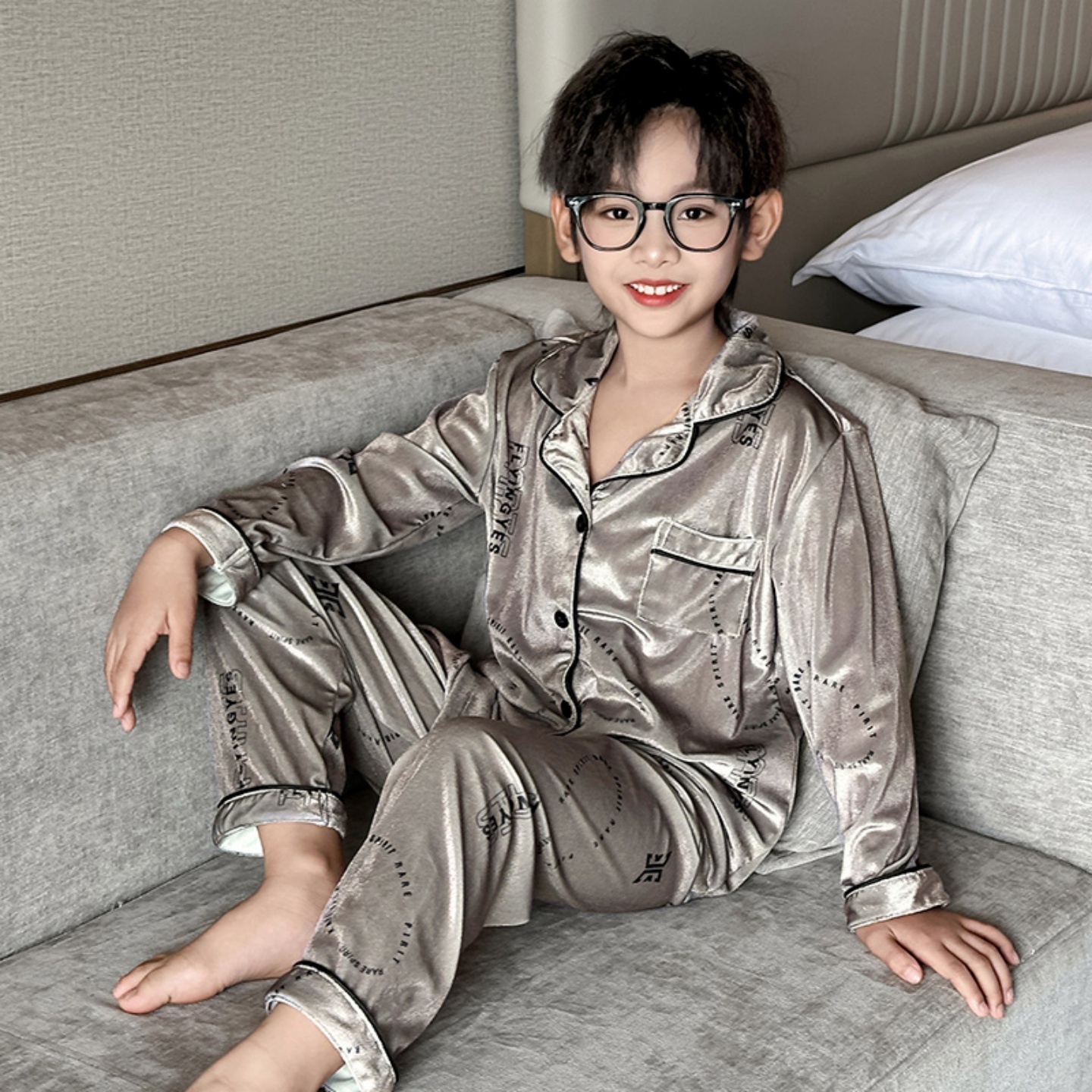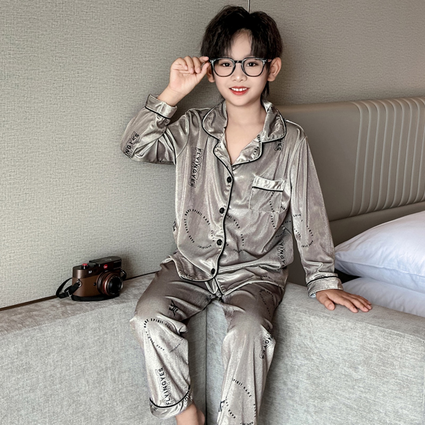 男童金丝绒睡衣春秋中大童薄绒家居服套6-12岁浅冬开衫长袖套装潮