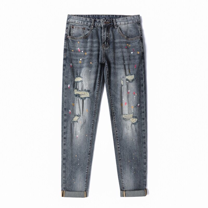 春夏季蓝色潮流印花刺绣牛仔裤男士潮牌韩版修身时尚小脚休闲长裤