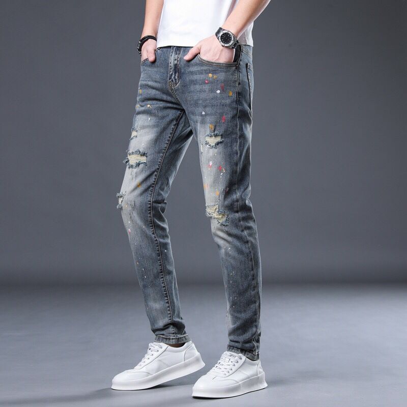 蓝色修身印花男士小脚牛仔裤