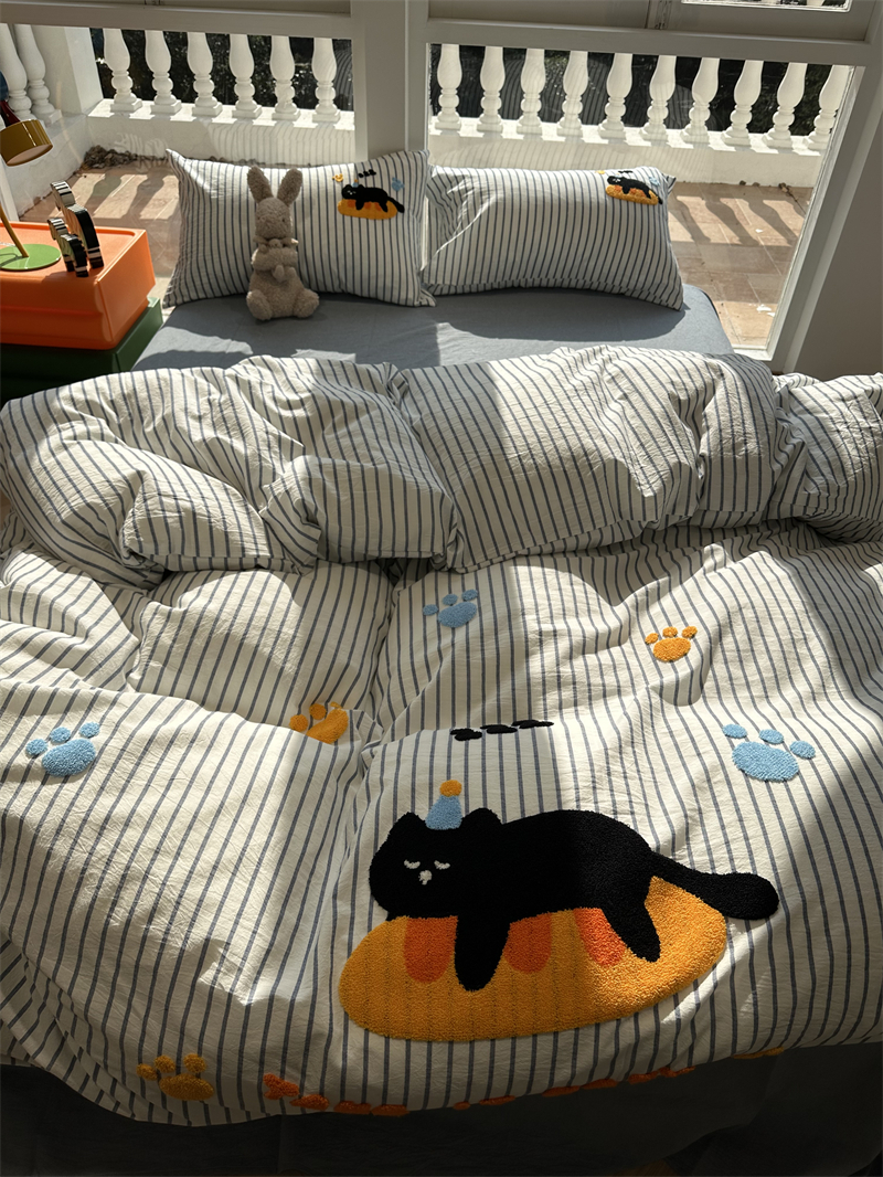 卡通可爱水洗棉毛巾绣趴趴猫四件套1.5m1.8米少女床单被套三件套