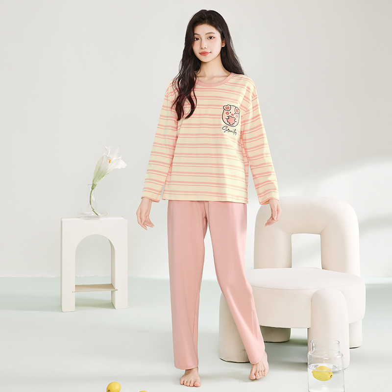 玛伦萨睡衣女纯棉带胸垫可外穿女士家居服套装长袖长裤圆领套头款