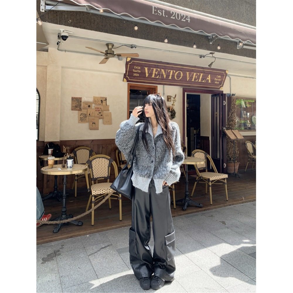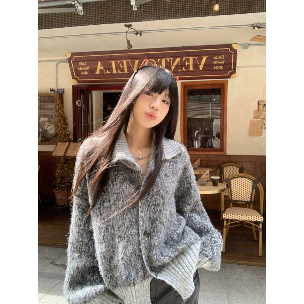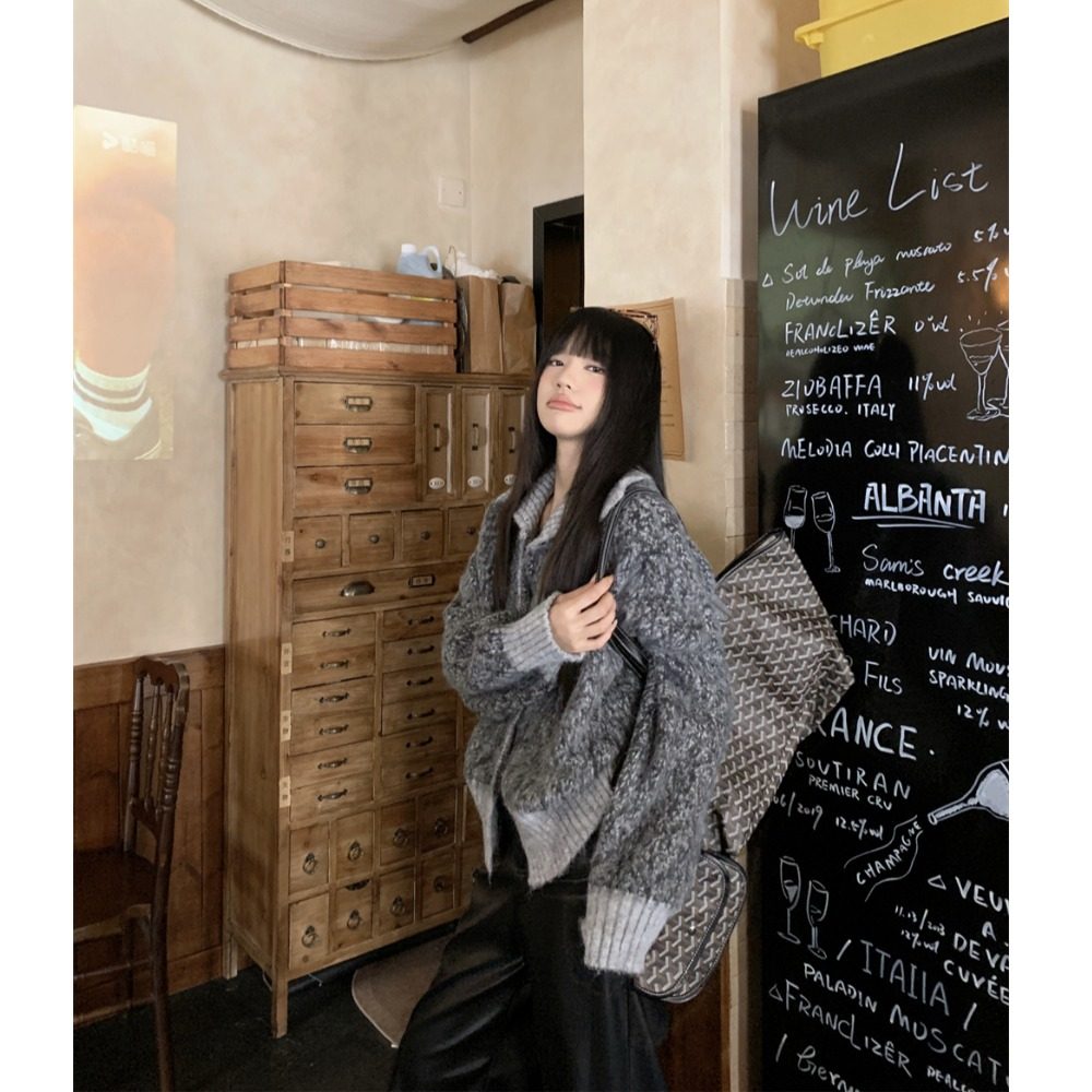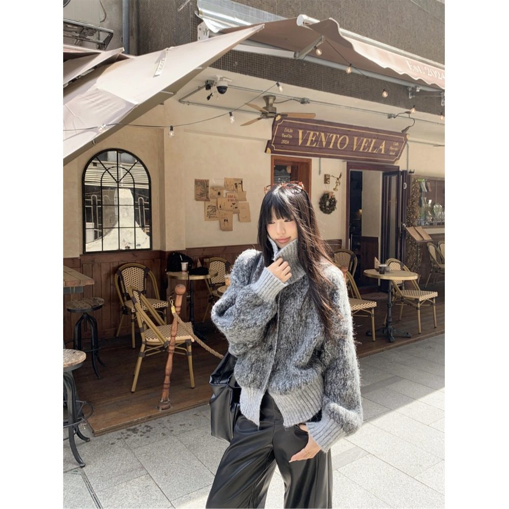 高领灰色毛衣外套女秋冬慵懒高级感翻领宽松休闲加厚针织开衫上衣