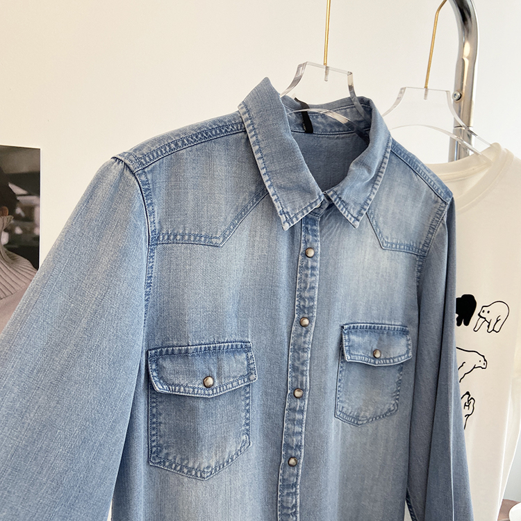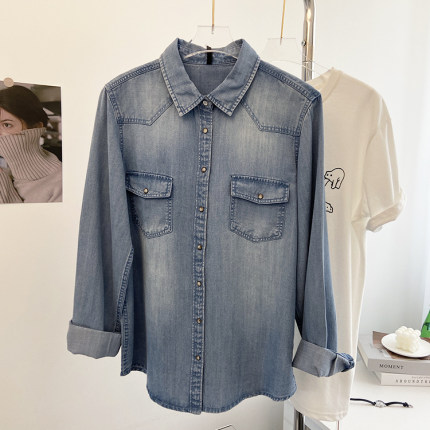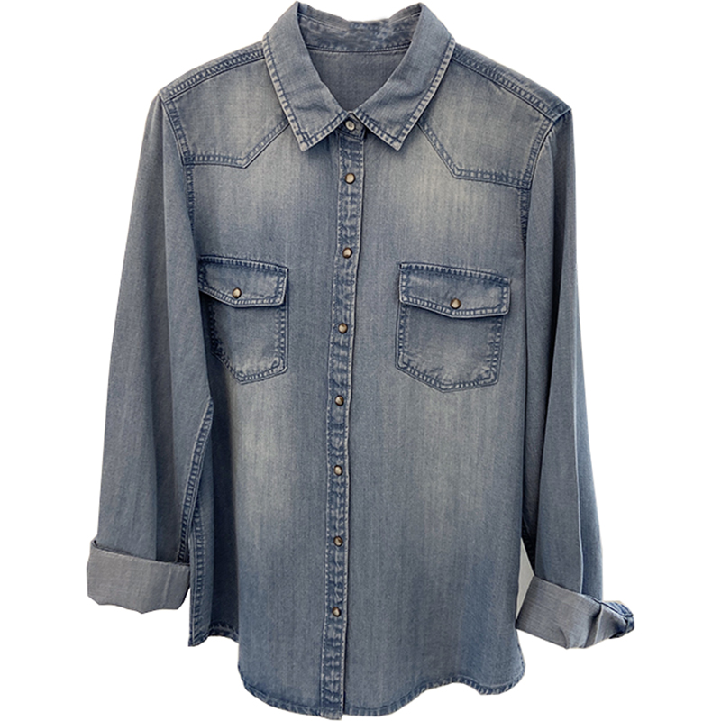 柠波家。复古水洗牛仔衬衫女春秋薄款柔软宽松百搭休闲衬衣外套潮