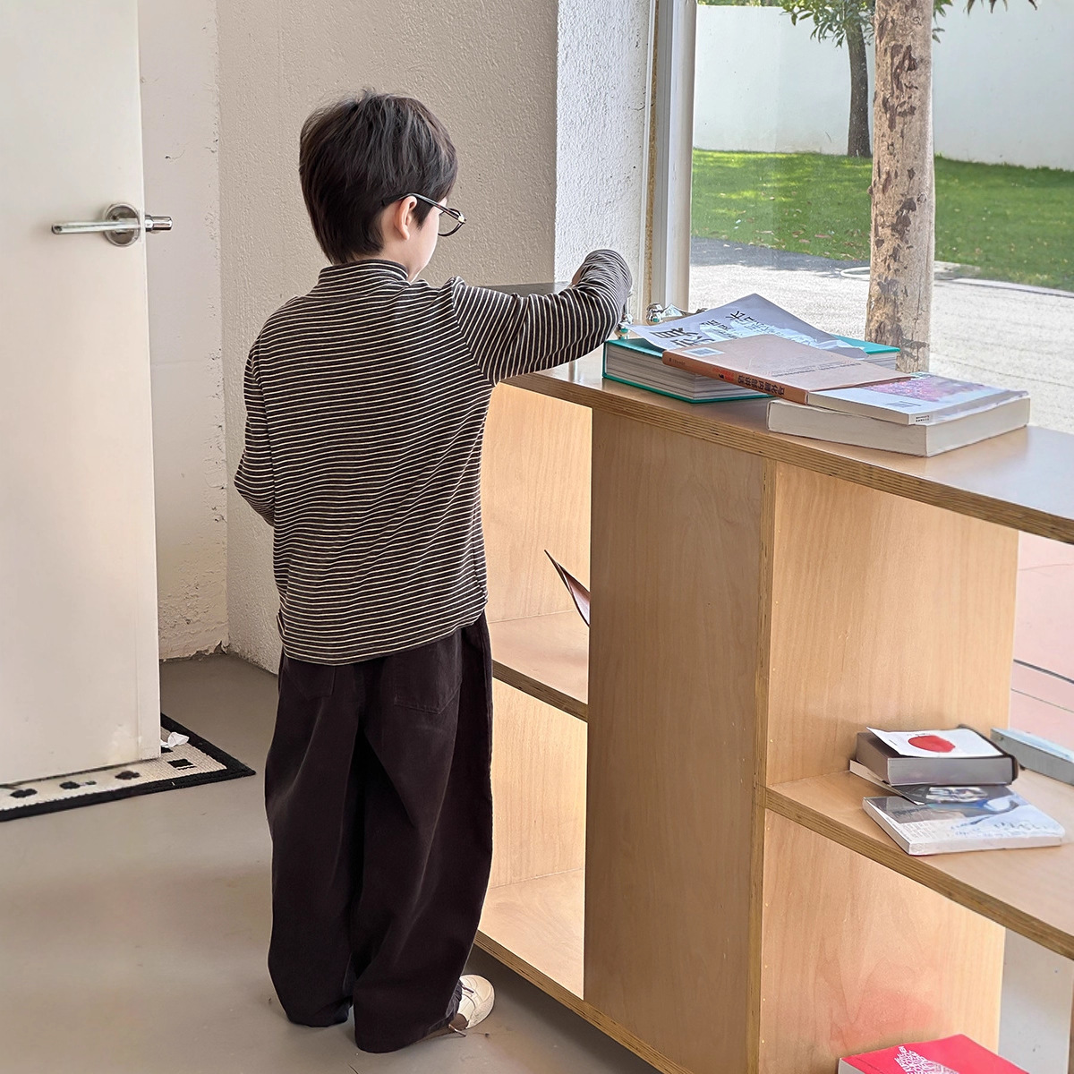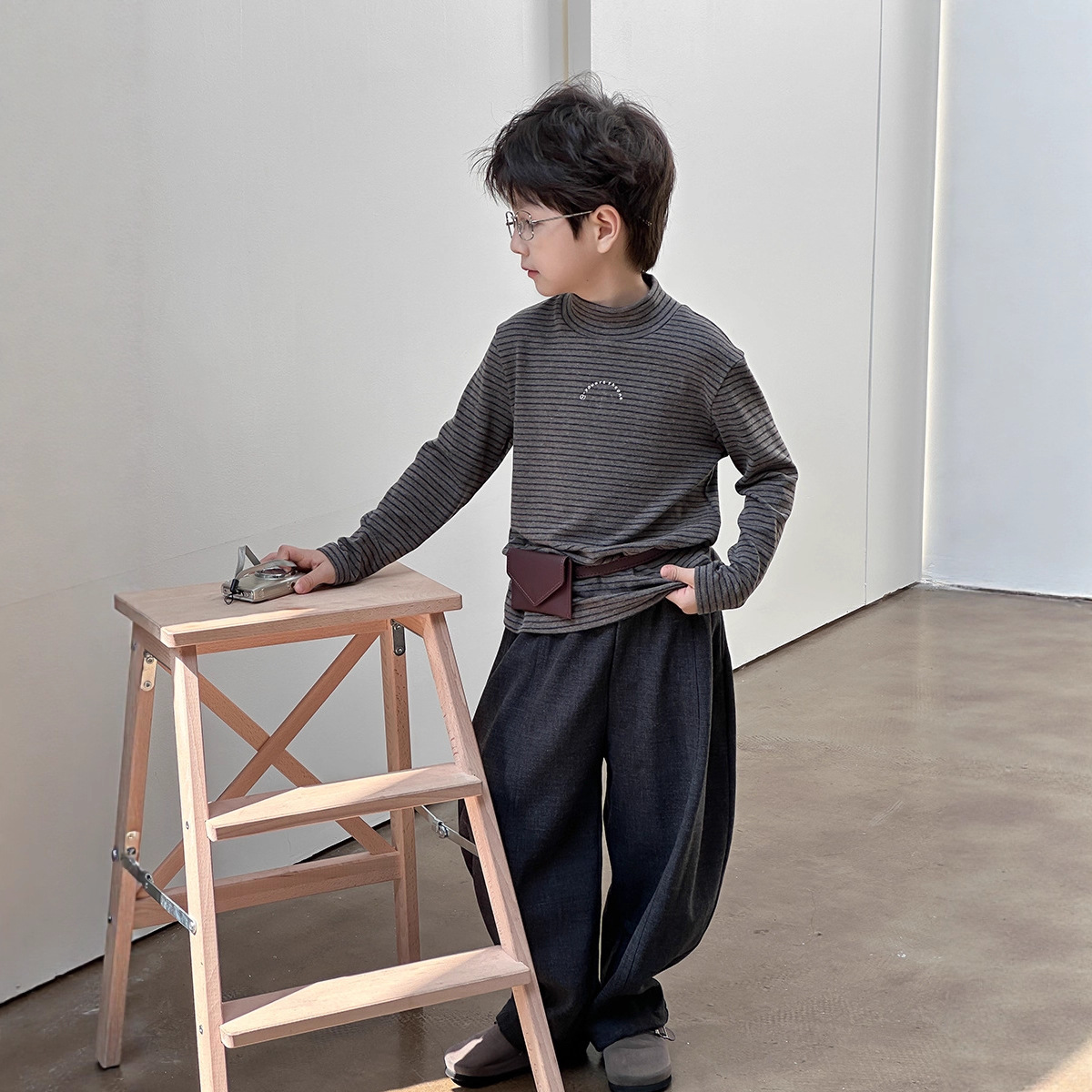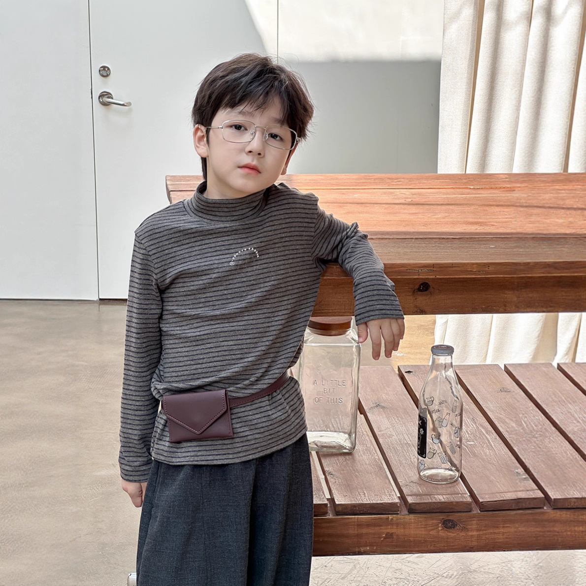 艾摩贝贝2025秋儿童百搭羊绒上衣男女童中领高弹条纹保暖打底衫