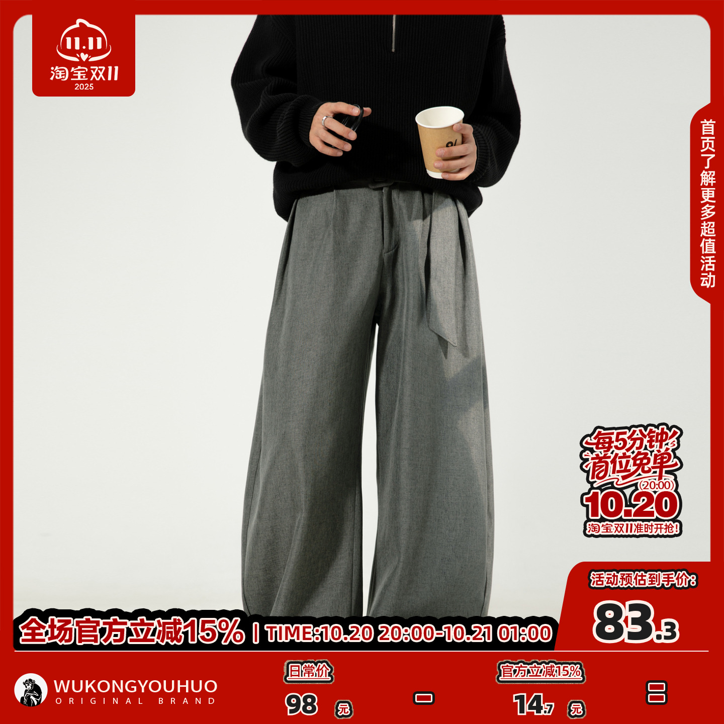 悟空有货老钱风腰带亚麻纹弯刀西裤男松弛感宽松阔腿休闲西装长裤