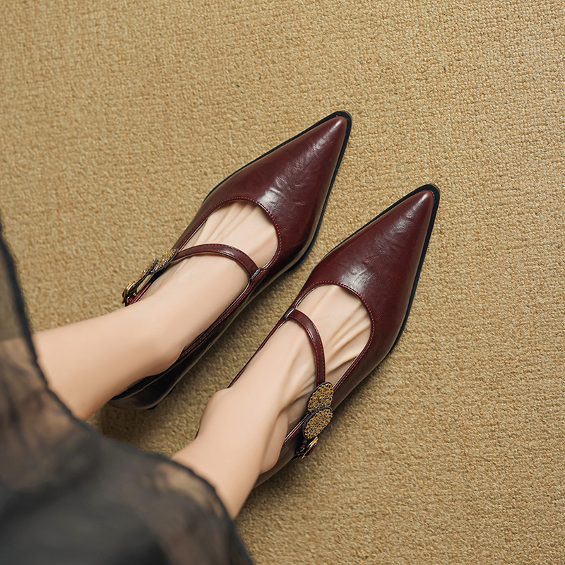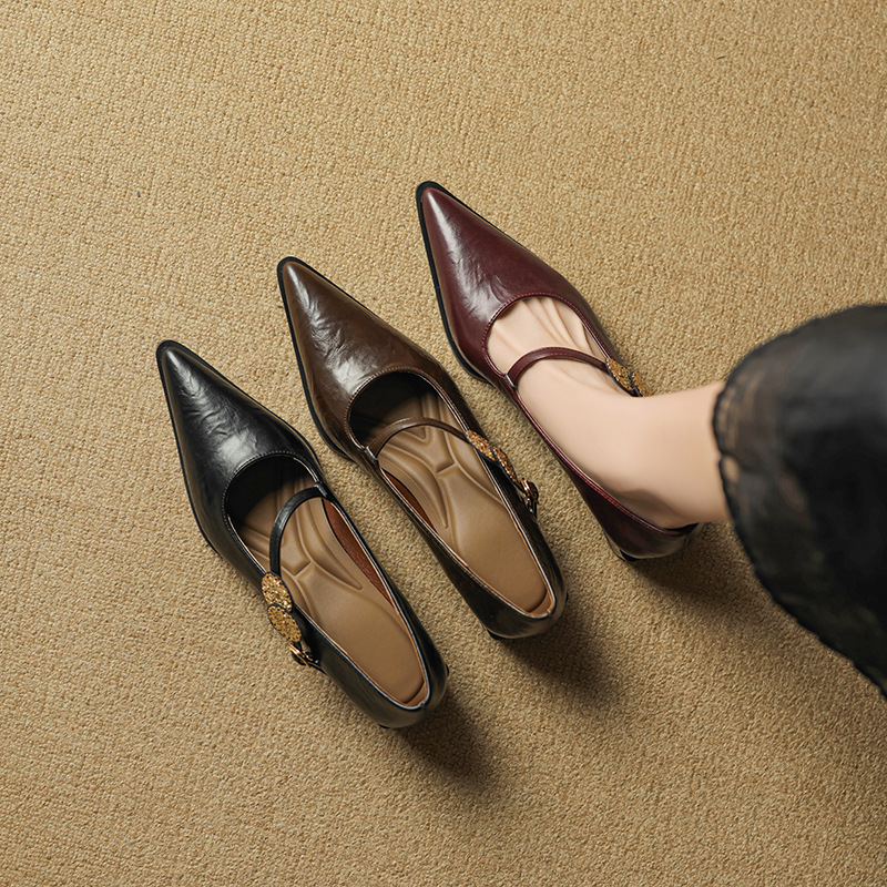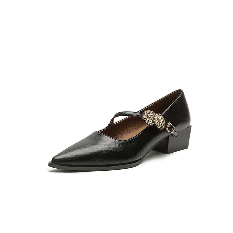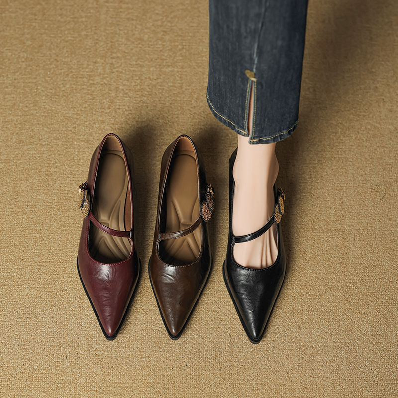 羊皮版~复古浅口高跟鞋女不累脚一字扣粗跟单鞋尖头气质玛丽珍鞋