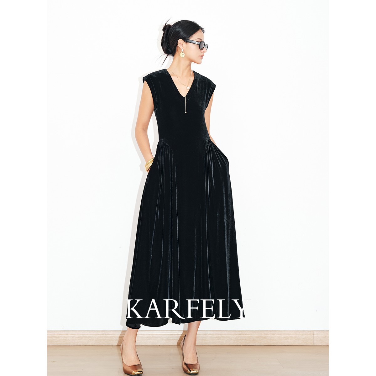 KARFELY/重磅真丝丝绒连衣裙覆古背心裙V领高级感小黑裙A字长裙