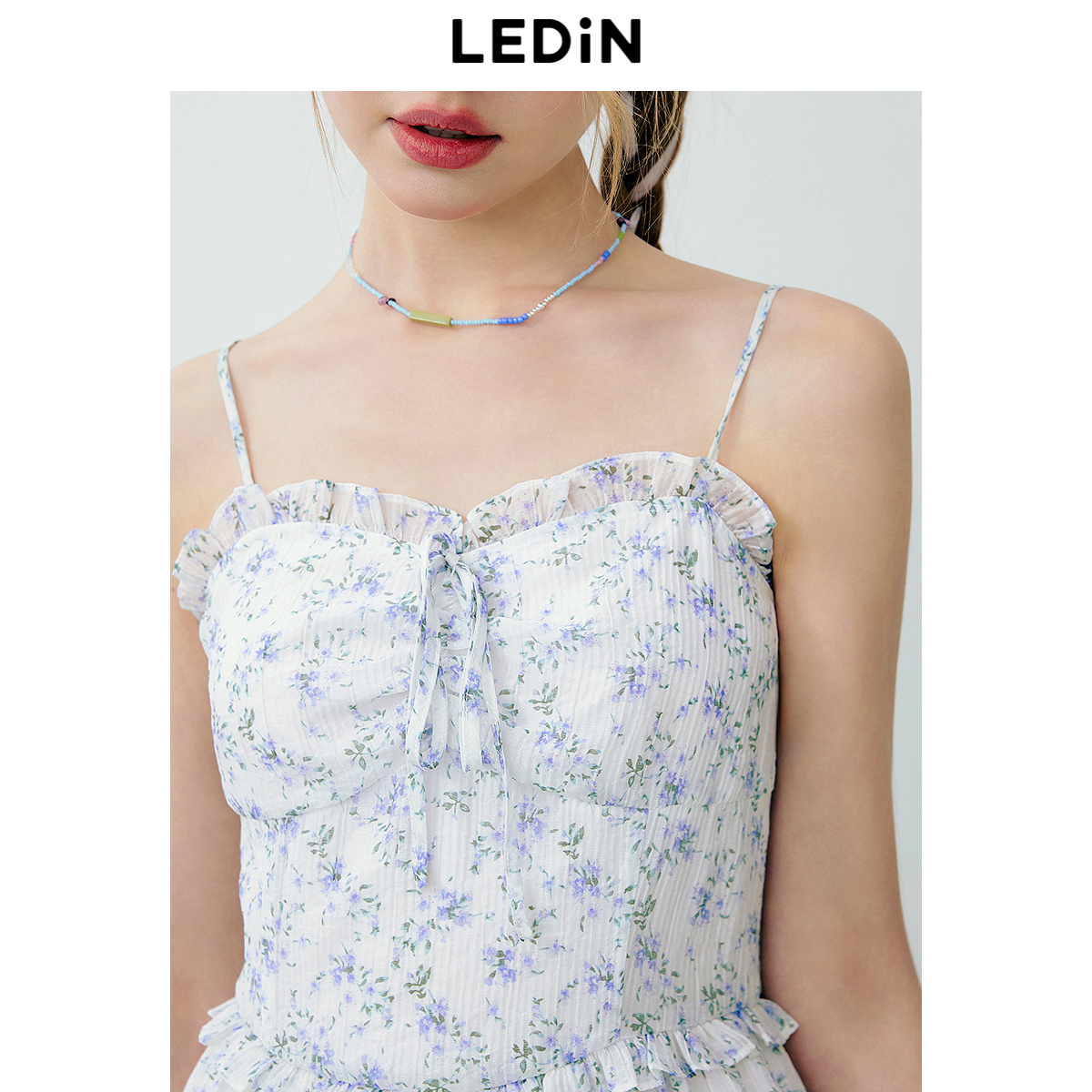 乐町清新雪纺碎花吊带裙年夏季新款不规则多层下摆飘逸连衣裙