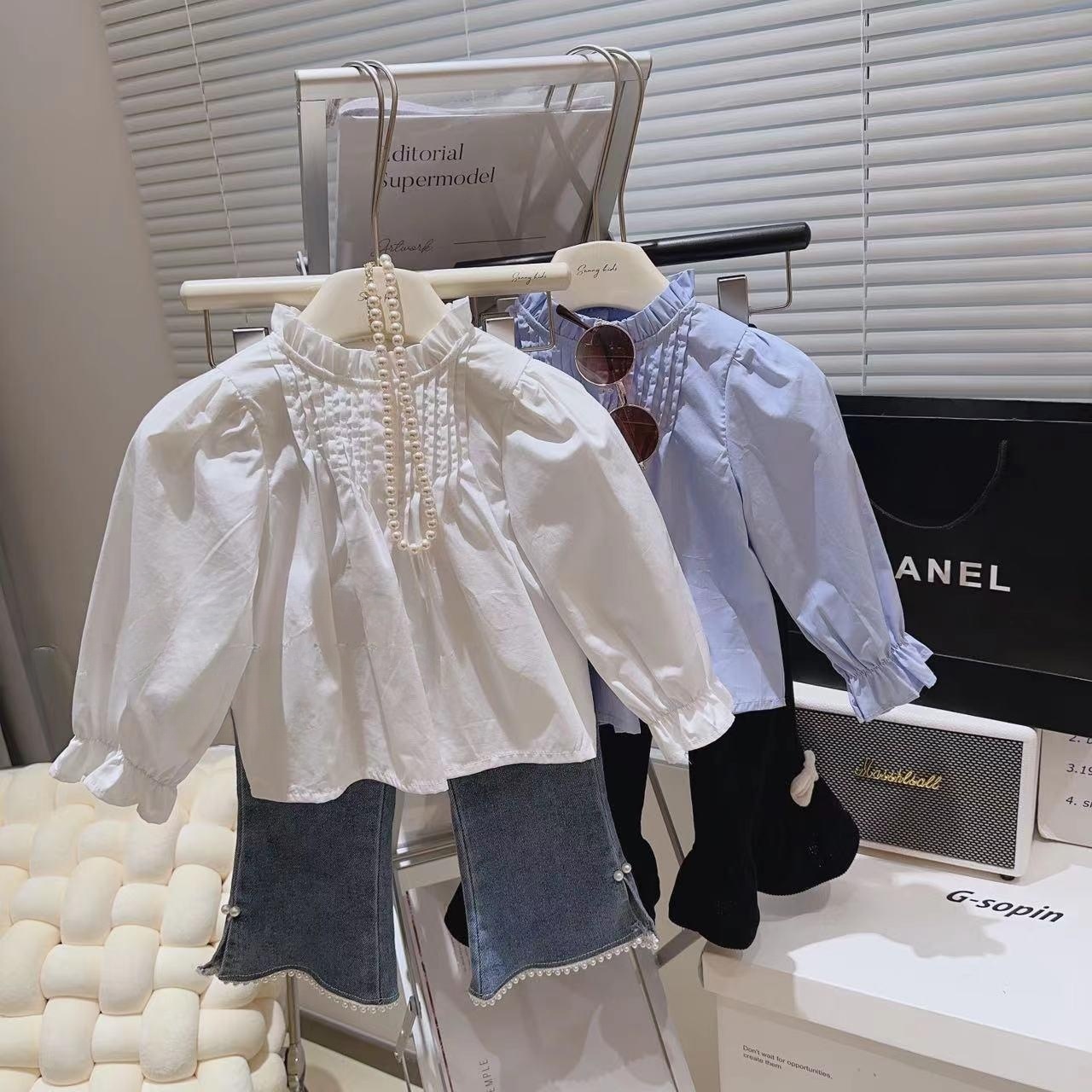 女童衬衫2025春秋款法式儿童立领压褶灯笼喇叭袖洋气公主上衣衬衣