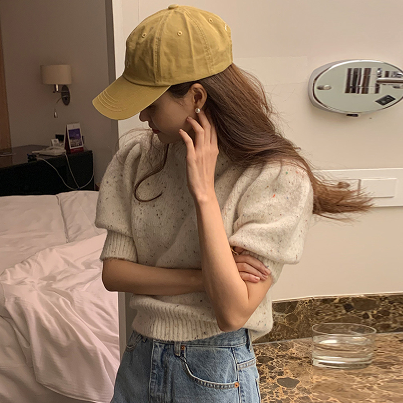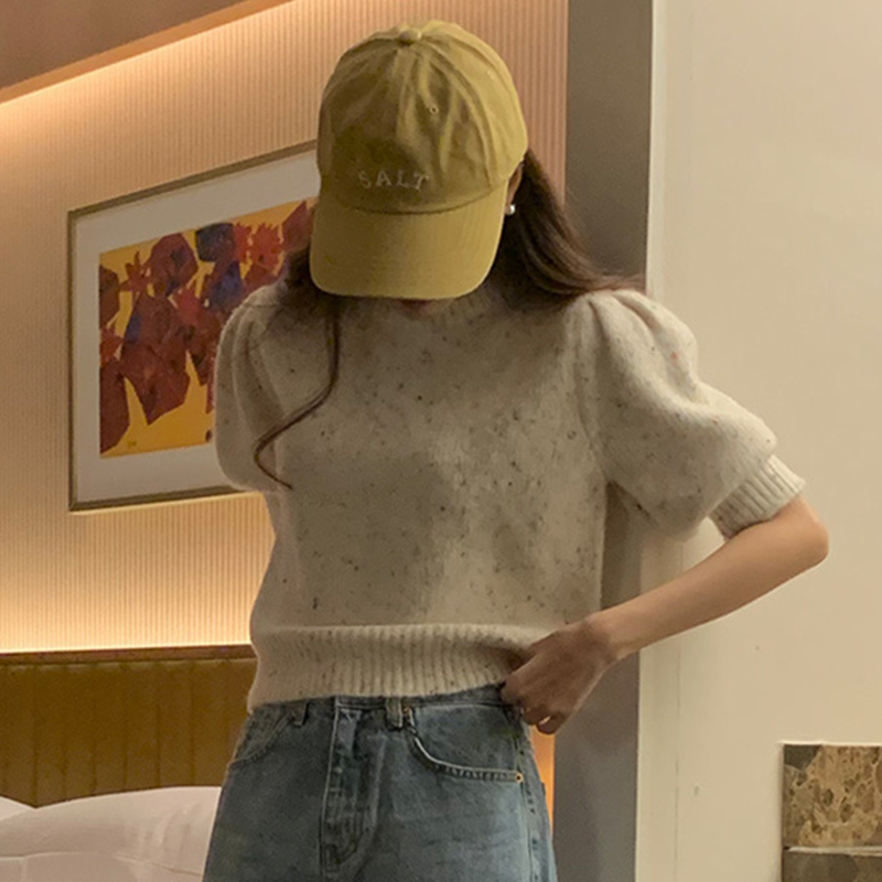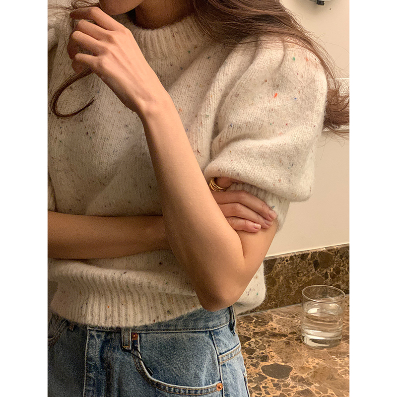 韩国chic春季温柔气质圆领混色设计感宽松百搭短袖针织衫毛衣女