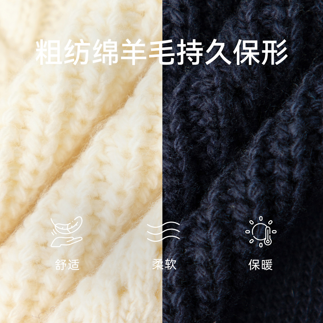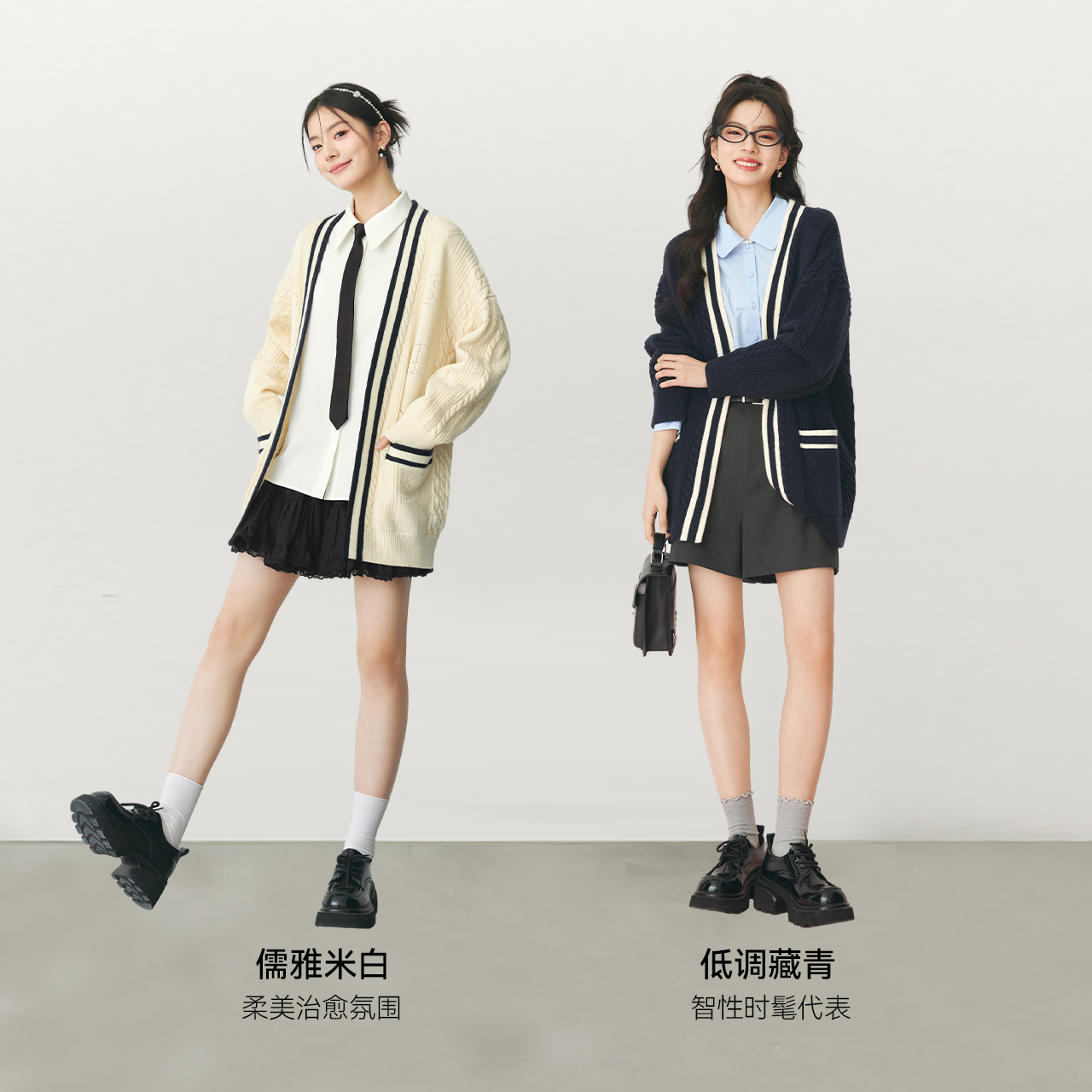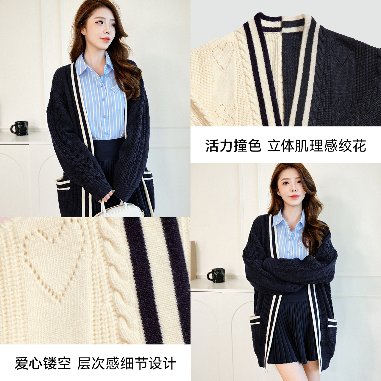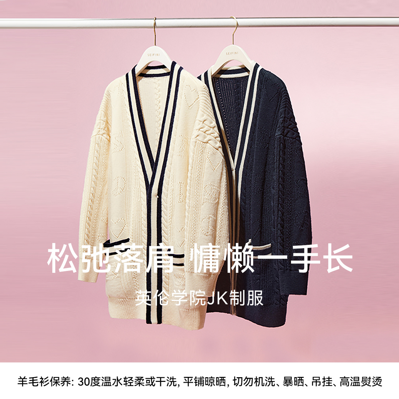 诗凡黎v领学院风撞色中长针织开衫春秋毛衣米色绞花羊毛衫外套女