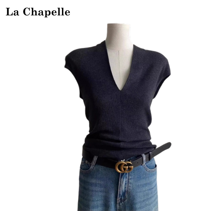 拉夏贝尔欧货V领针织短袖T恤女夏季新款时尚修身正肩小飞袖上衣