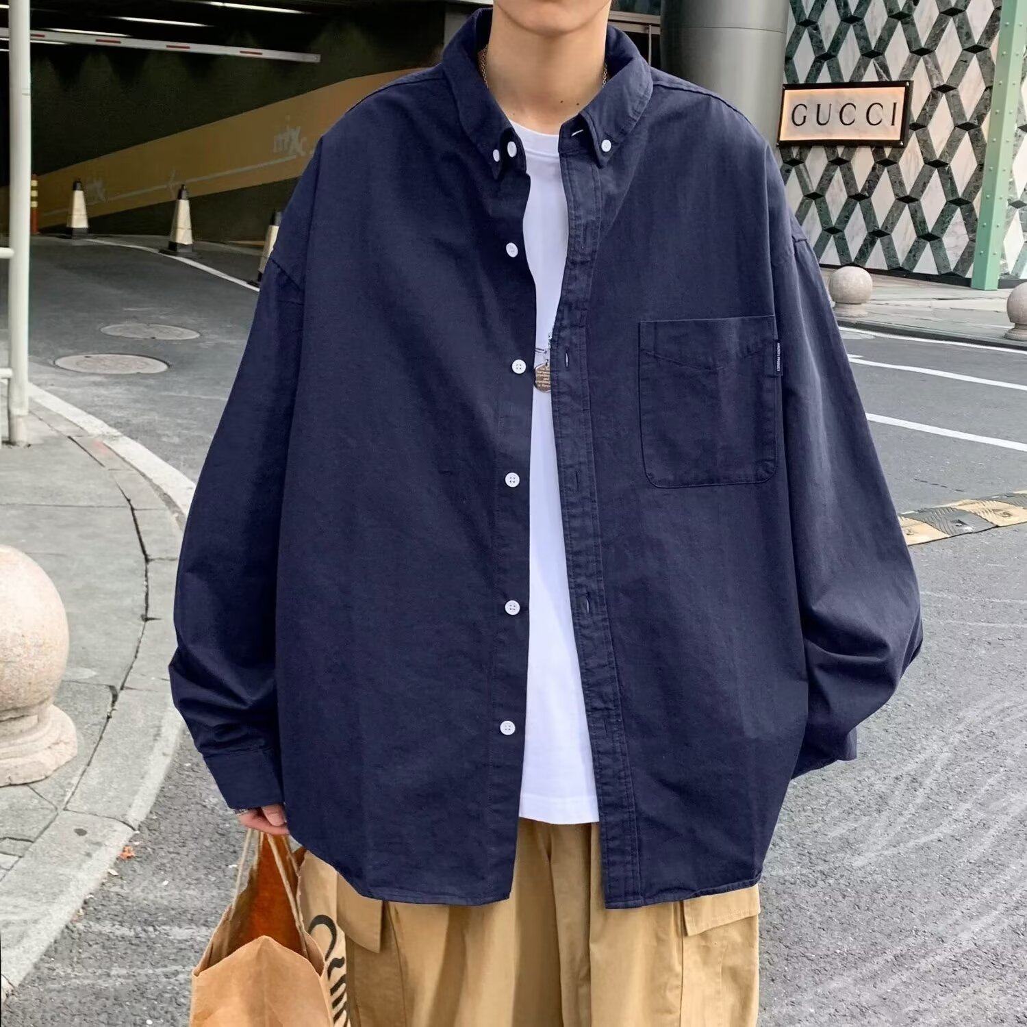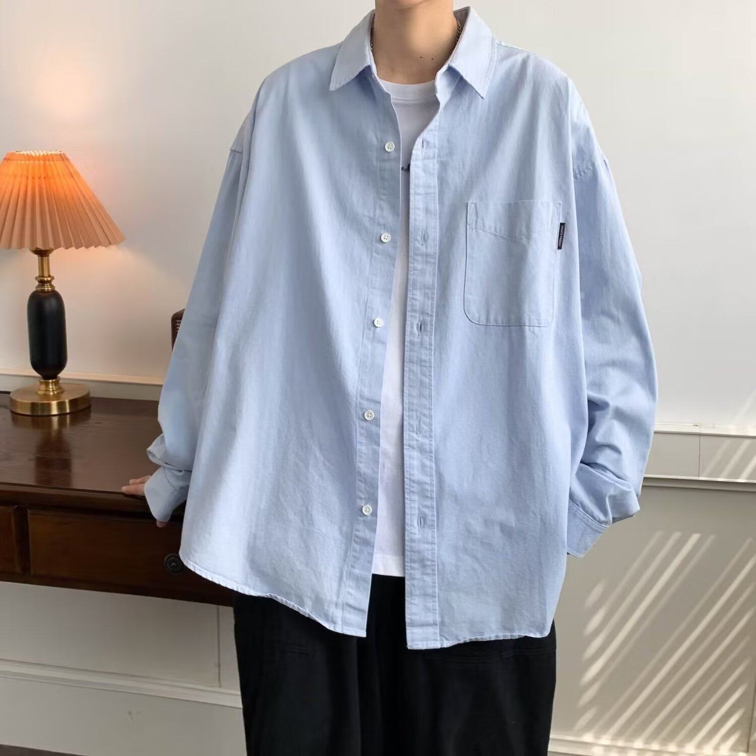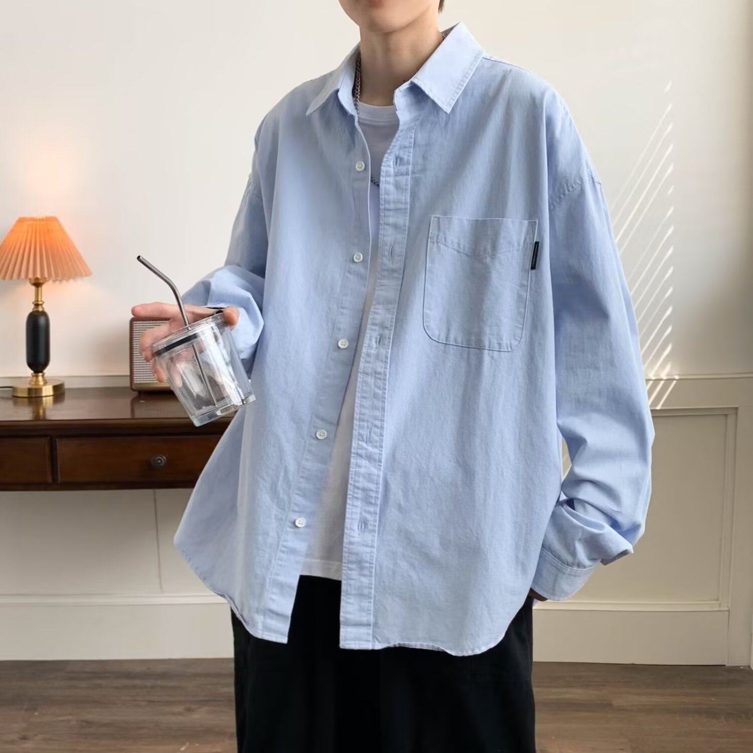 日系潮流文艺范蓝色外穿衬衫男长袖工装痞帅上衣春秋百搭衬衣外套