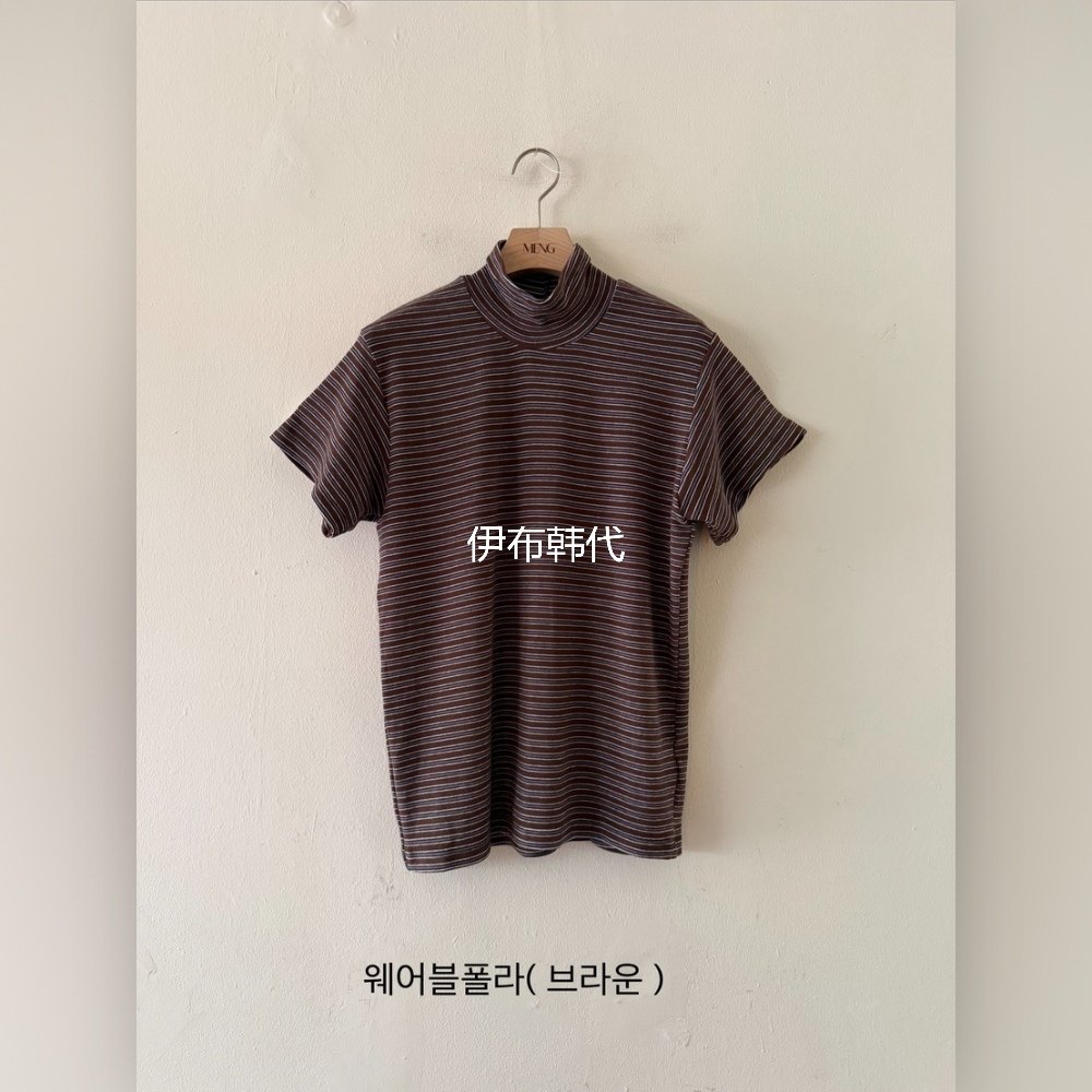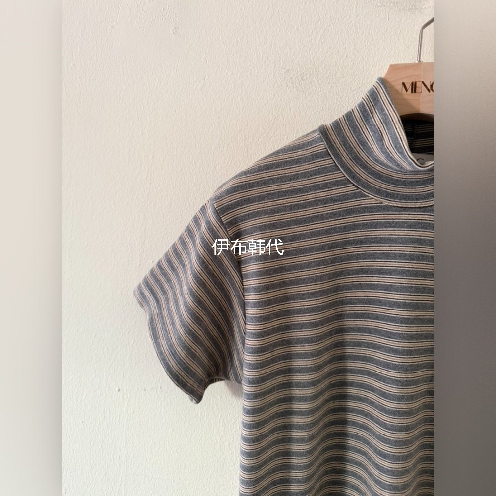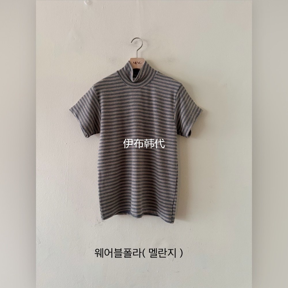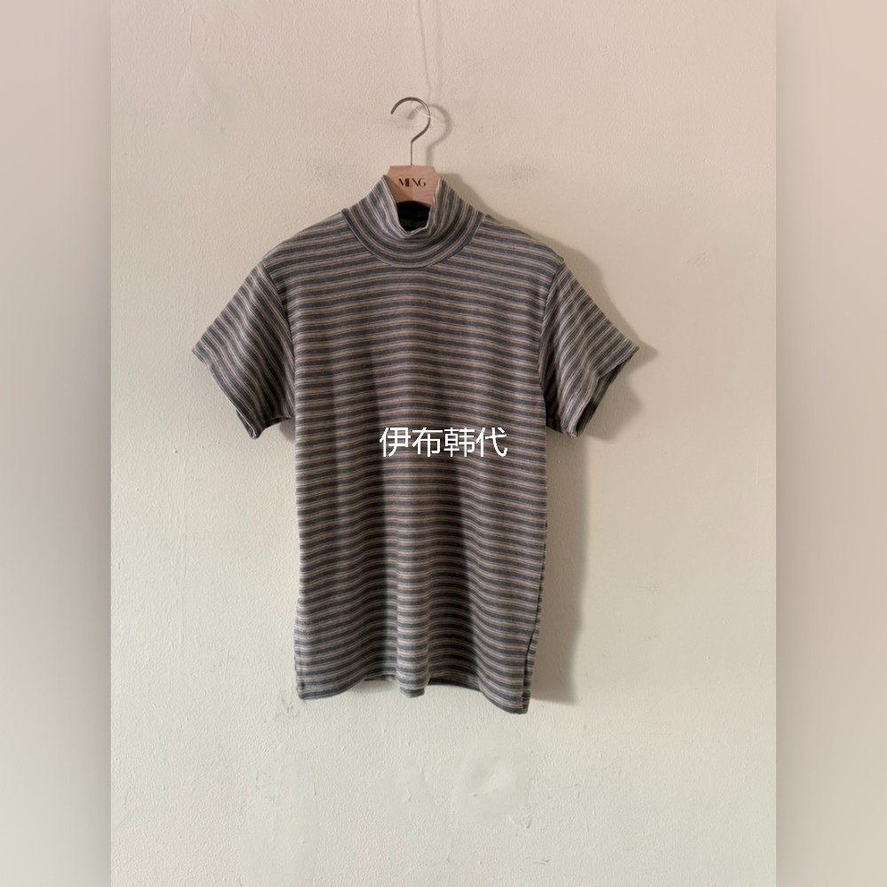 MENG韩国东大门正品代购冬款 高领休闲细条纹宽松短袖T恤女