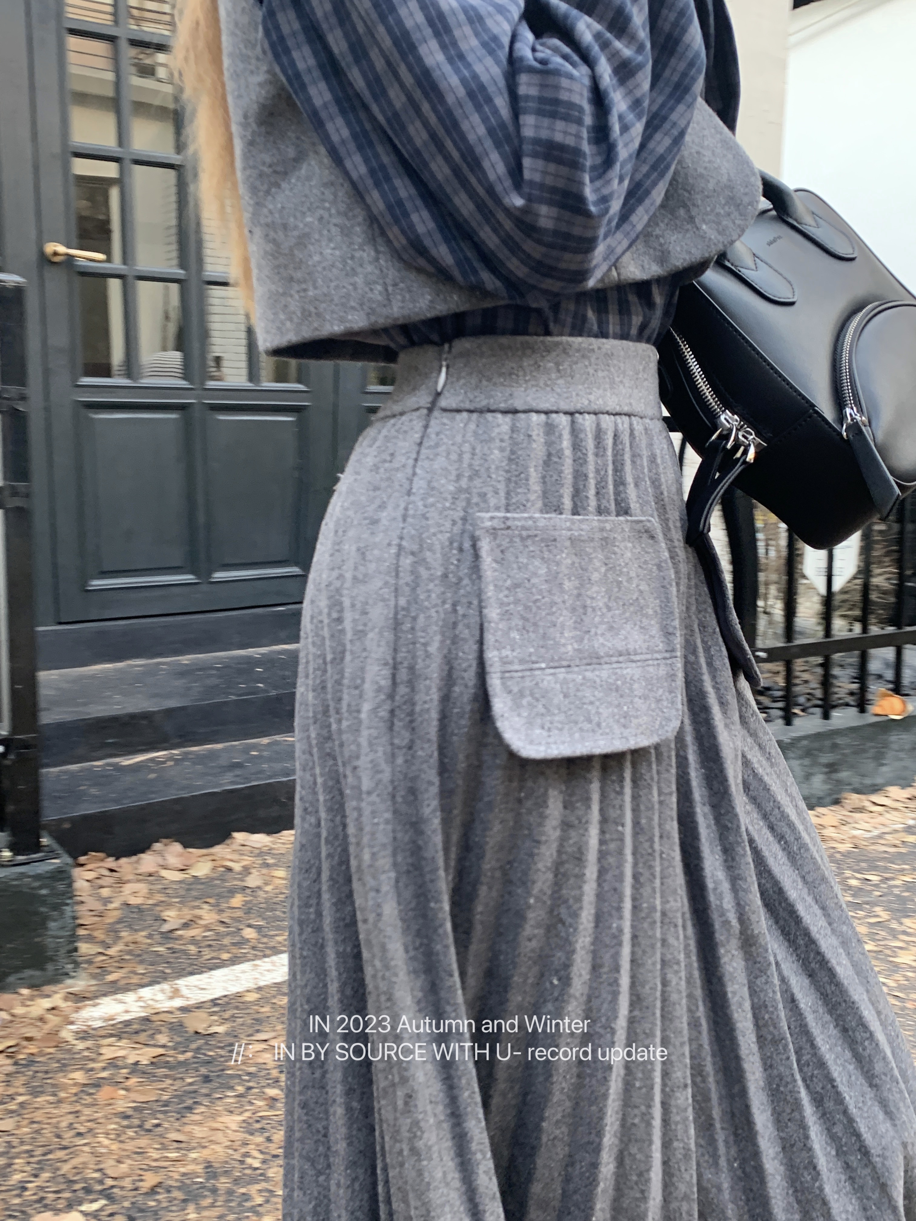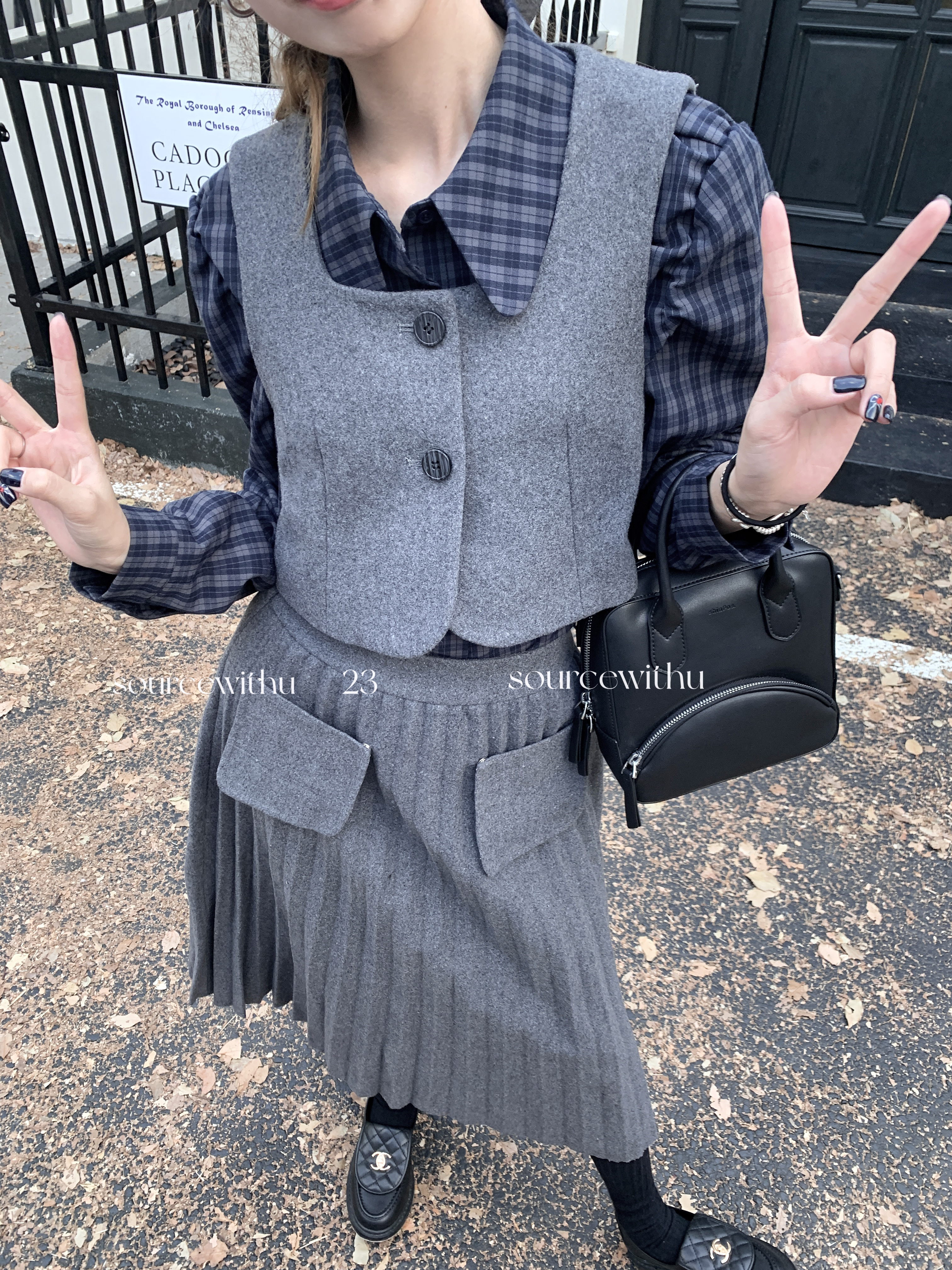 SourceWithU 美院生 气质羊毛呢马甲背心女款百褶灰色长款半身裙