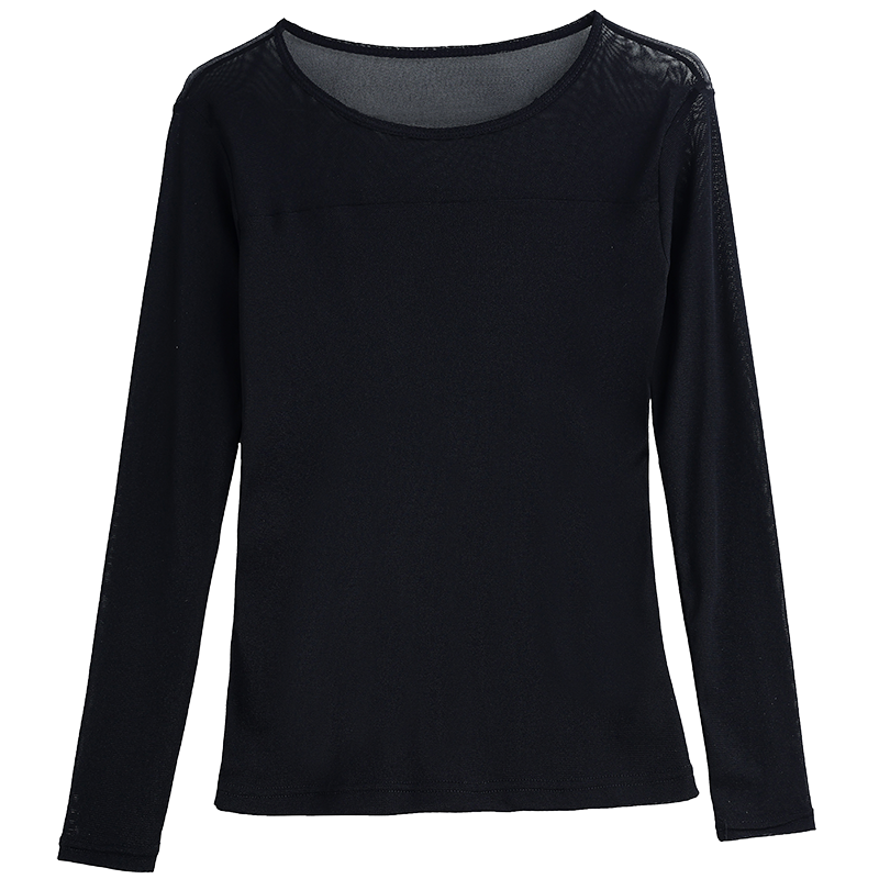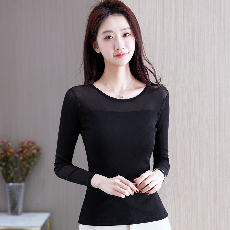 圆领打底衫女春秋装2025新款内搭长袖t恤黑色网纱紧身上衣百搭潮