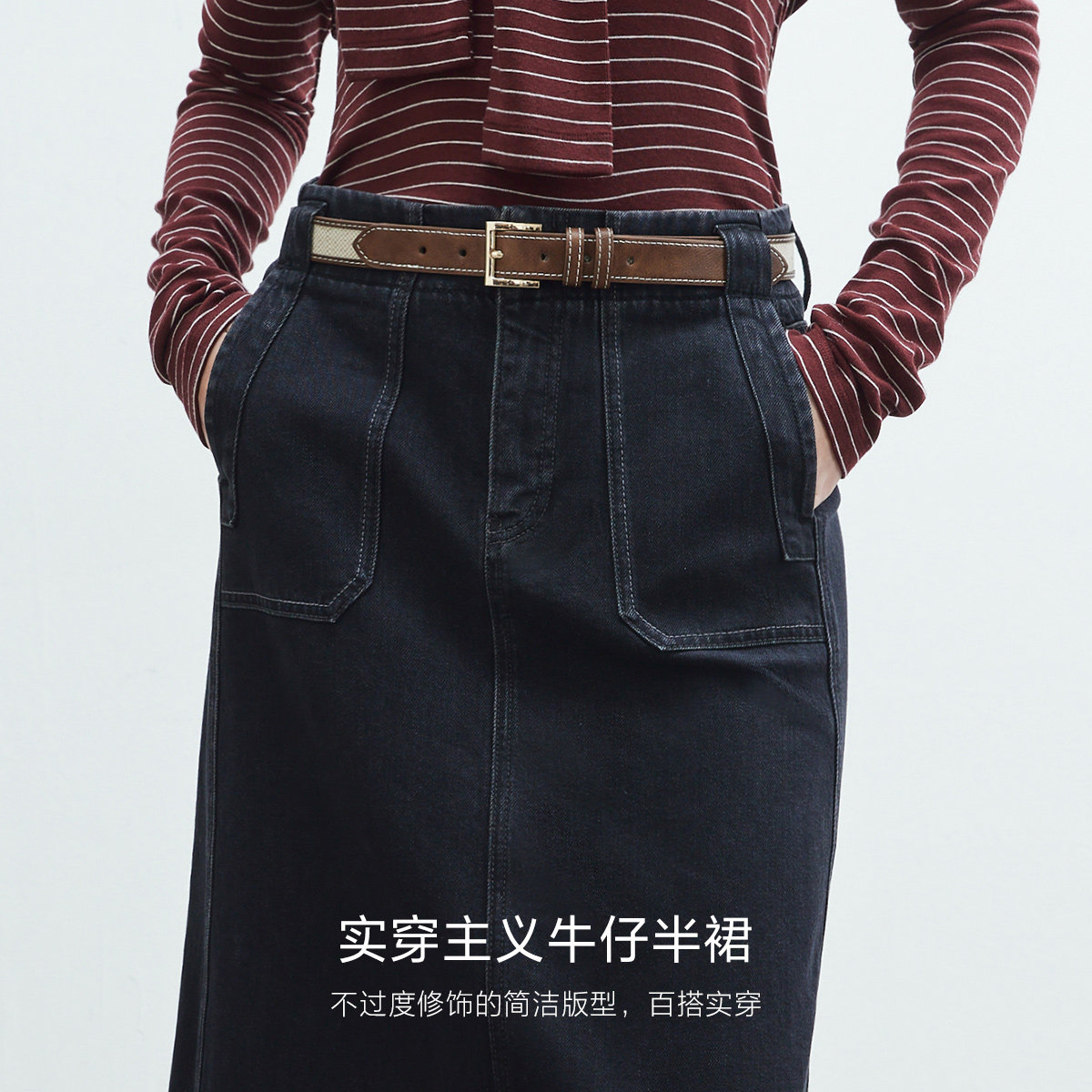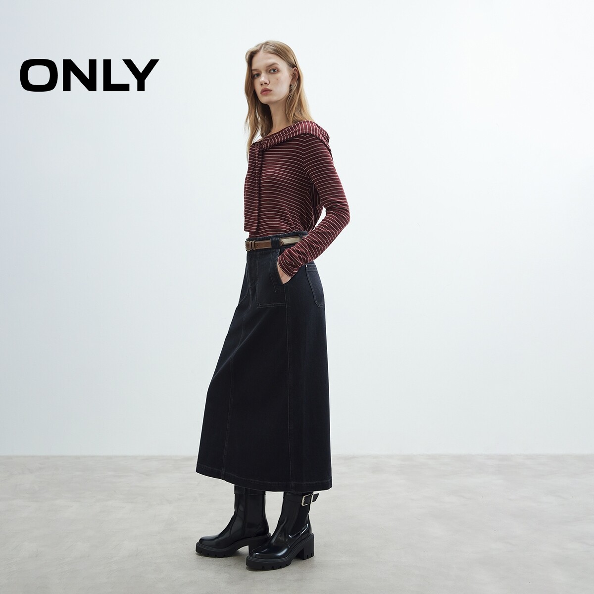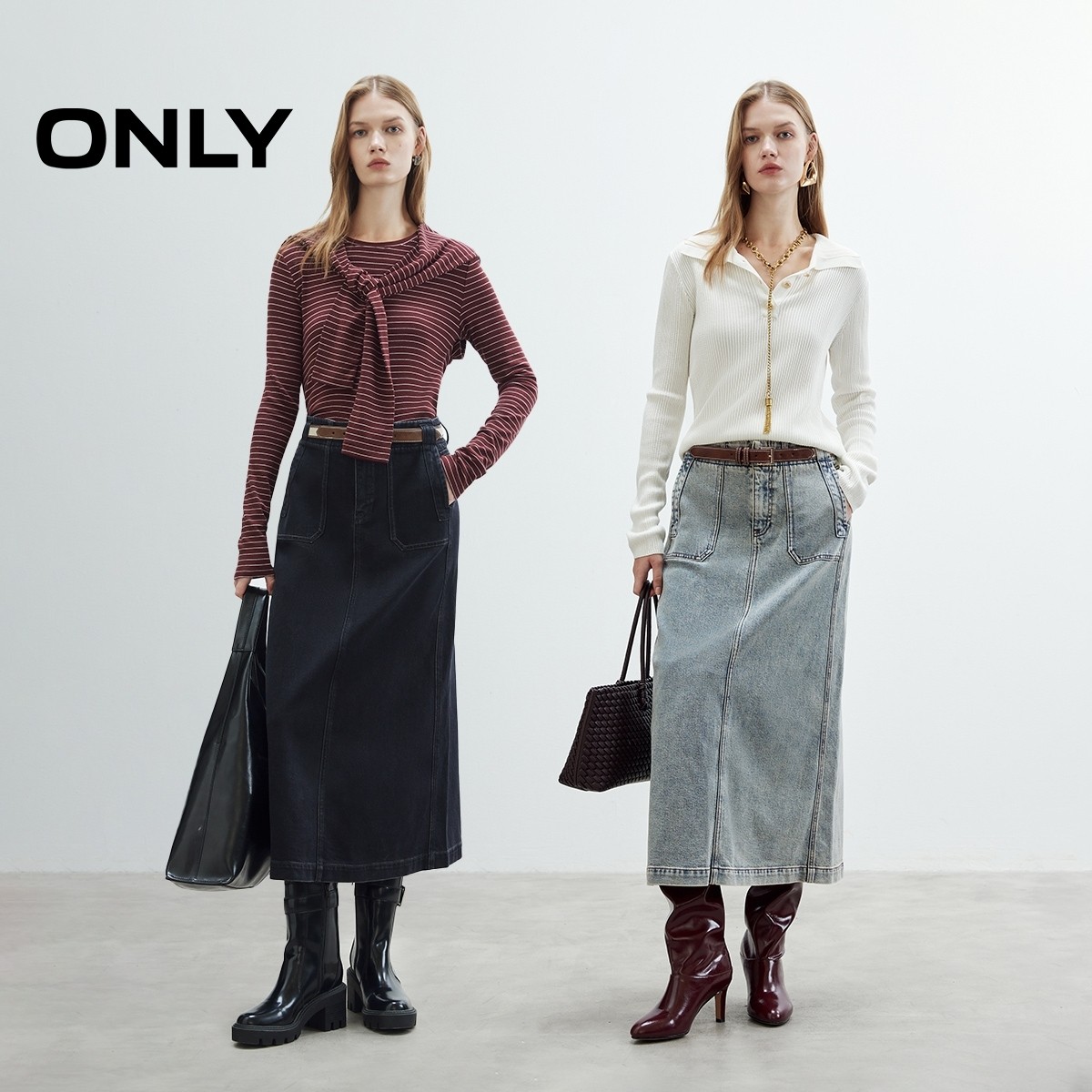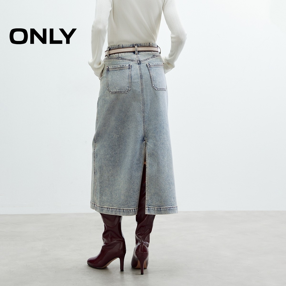 ONLY2025冬季新款复古水洗实用口袋开衩高腰A字伞裙牛仔半身裙女