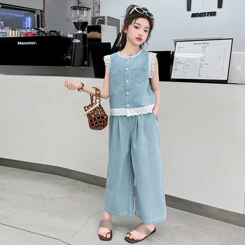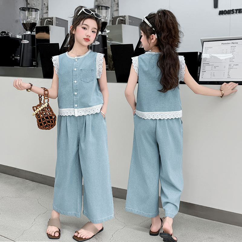 女大童夏季无袖阔腿裤套装2025新款超洋气夏装薄款牛仔背心两件套