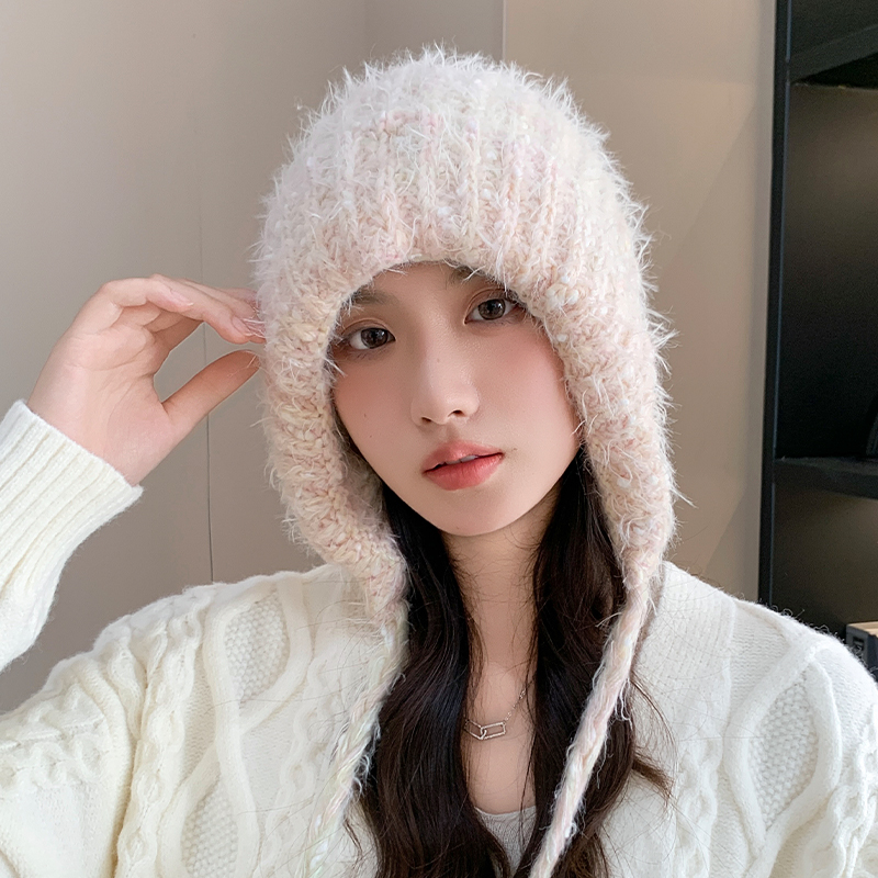 韩版毛绒流苏绑带毛线帽子女秋冬季大头围保暖护耳百搭针织包头帽