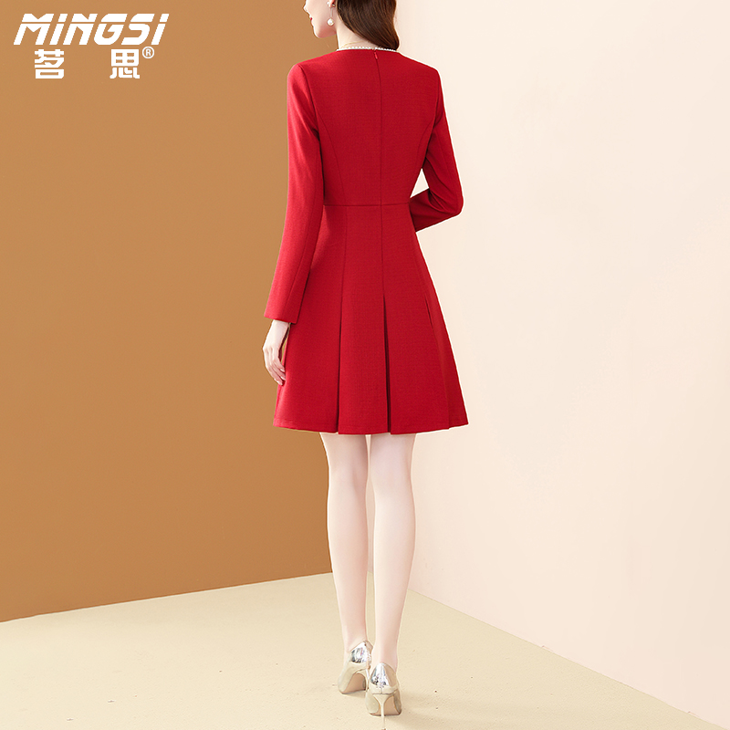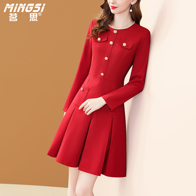 茗思高级感气质红色连衣裙女秋季2025新款钉珠小个子显瘦百褶裙子