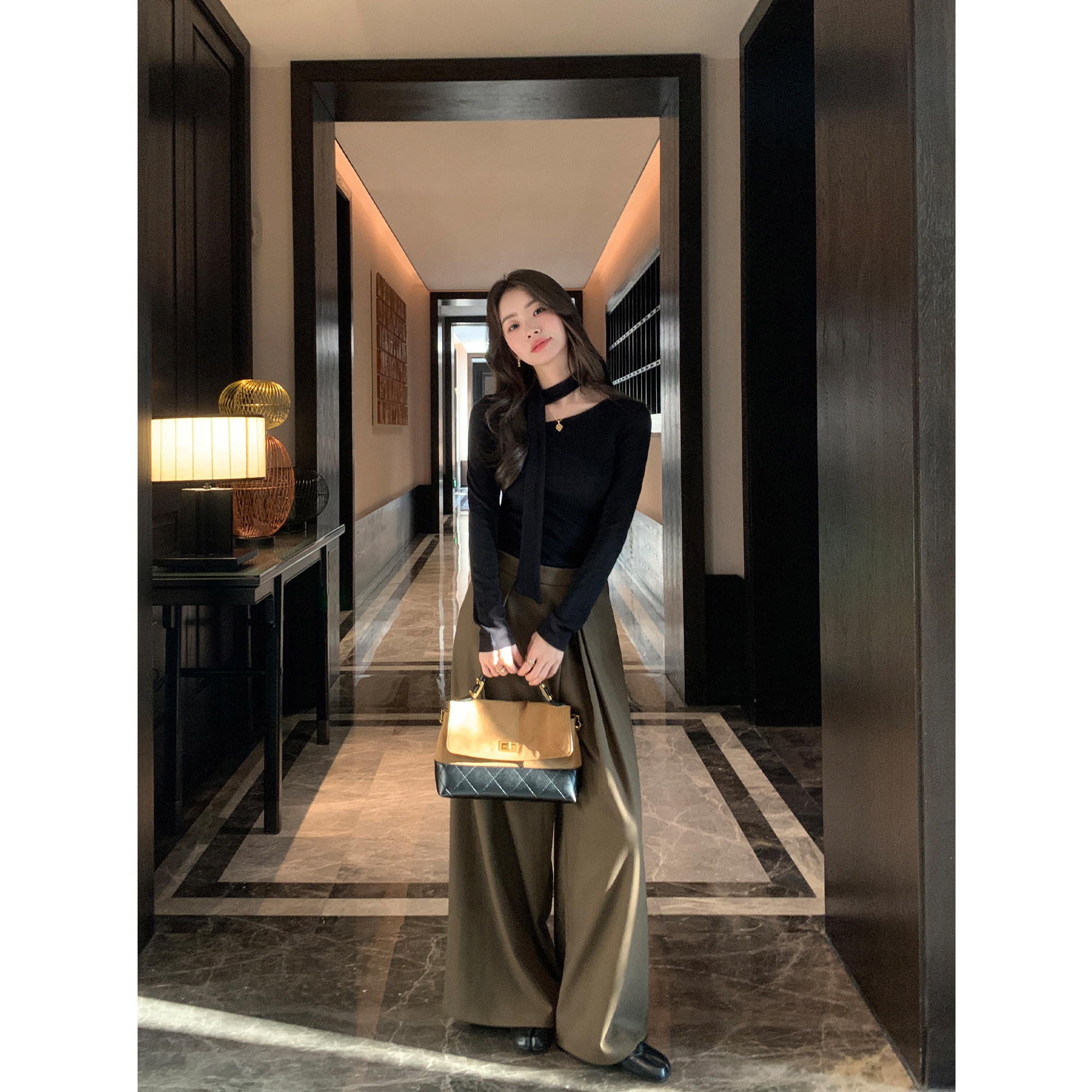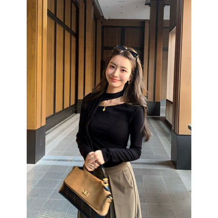 pusumede温柔姐感 气质斜肩飘带长袖t恤女修身针织打底衫内搭上衣