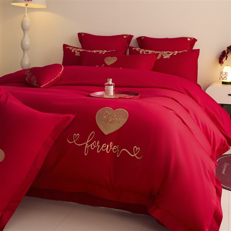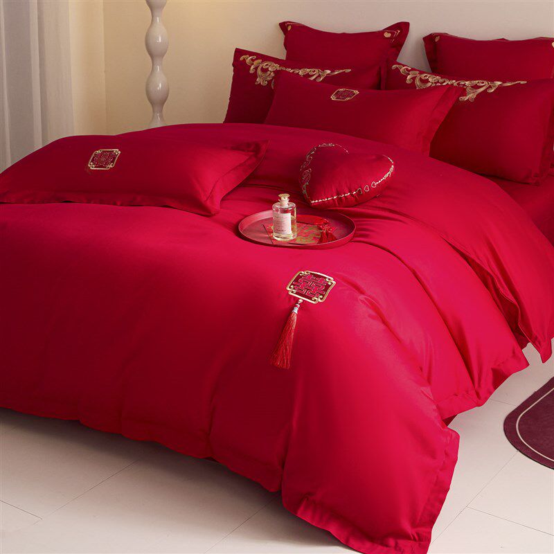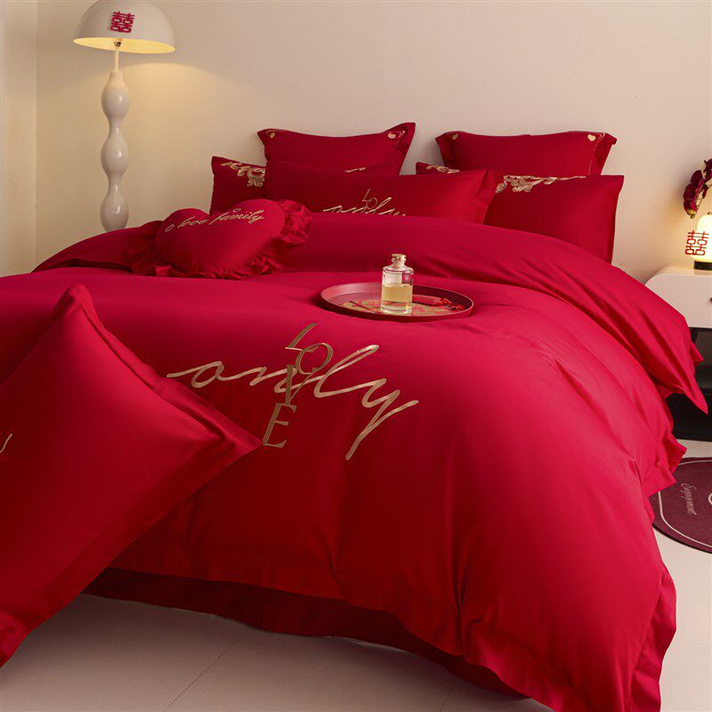 简约刺绣结婚四件套新婚庆红色陪嫁被套床单喜被床上用品备婚