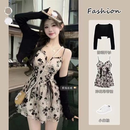 纯欲风碎花吊带连衣裙套装女夏季新款木耳边防晒开衫V领收腰短裙