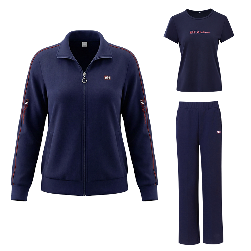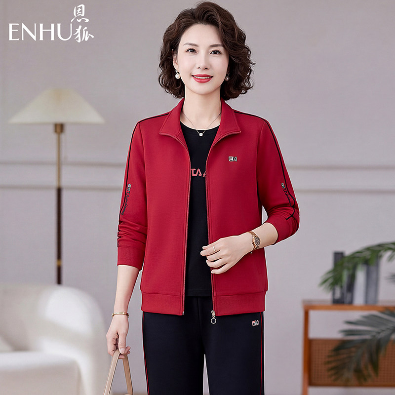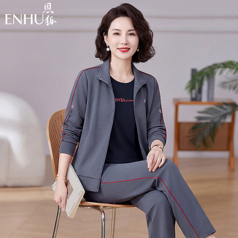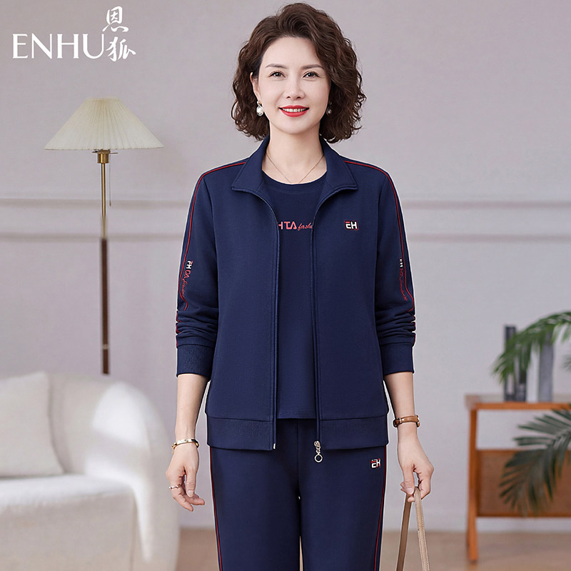 恩狐中老年时尚宽松休闲运动套装妈妈装长袖开衫拉链翻领三件套