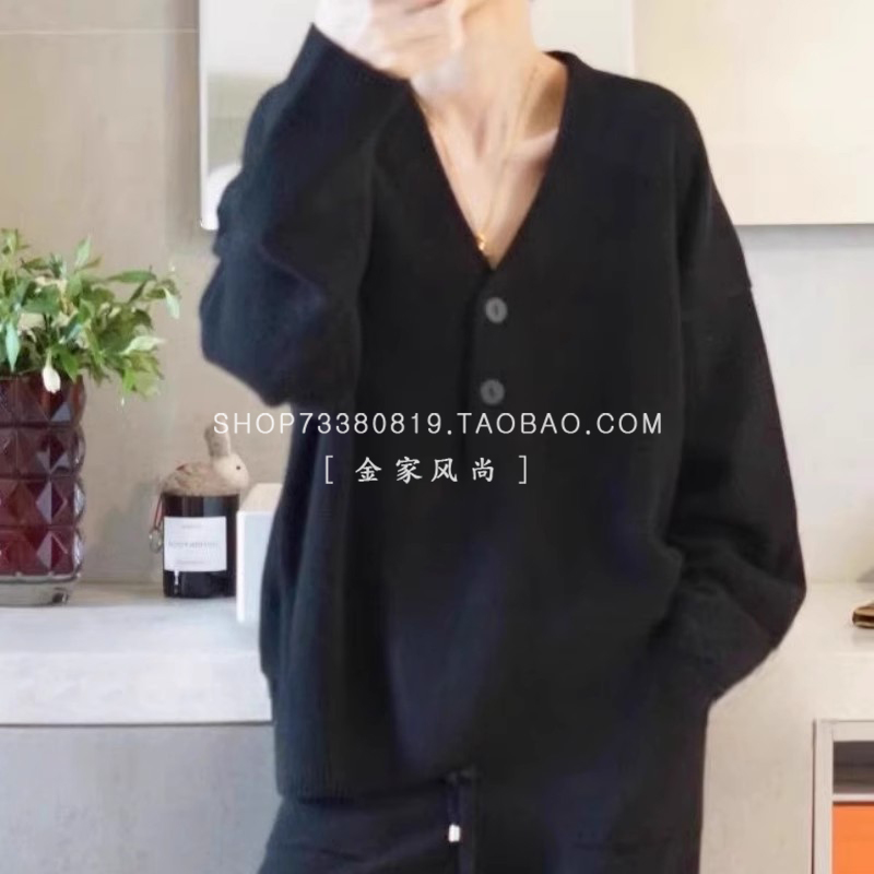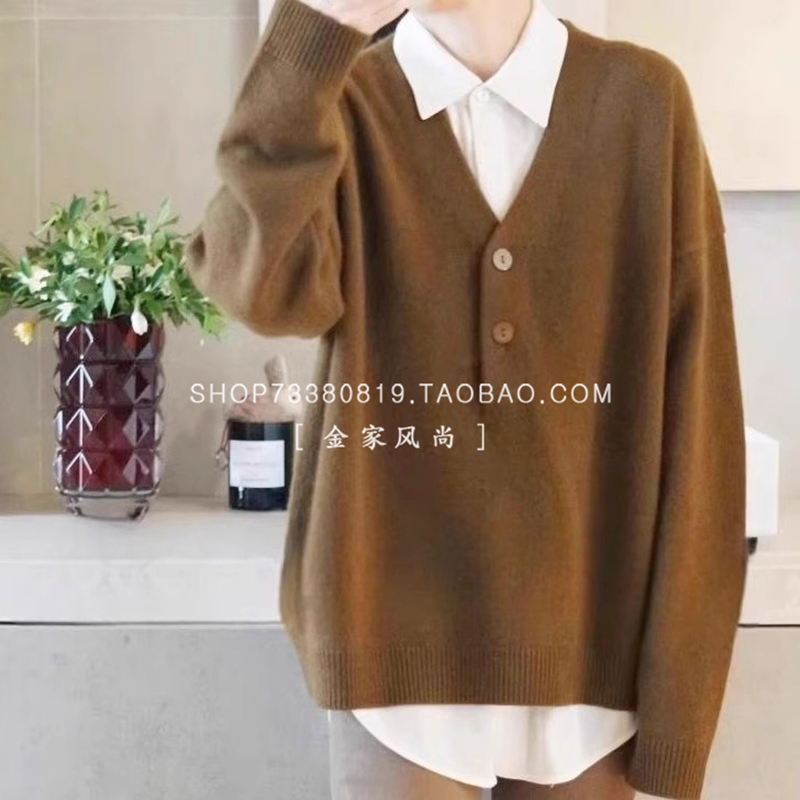 心动不已有腔调的一件羊绒衫V领系扣弯刀袖宽松羊绒毛衣秋冬季