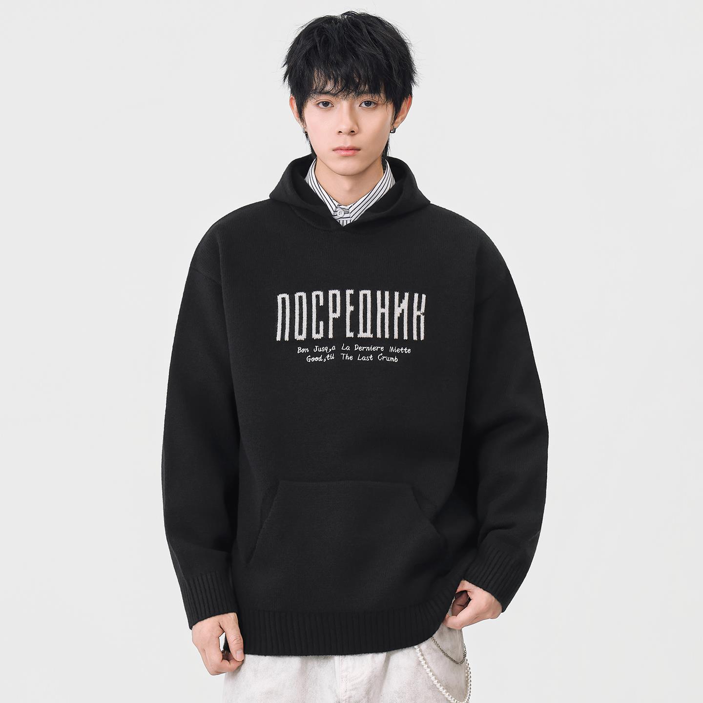 以纯连帽套头毛衣男士日系提花针织衫宽松百搭潮流休闲毛线衣情侣