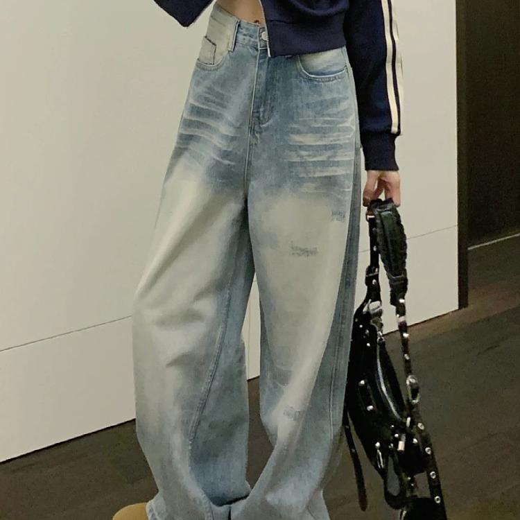 大码美式vibe风磨破牛仔裤女春秋新款抓纹直筒宽松显瘦阔腿拖地裤