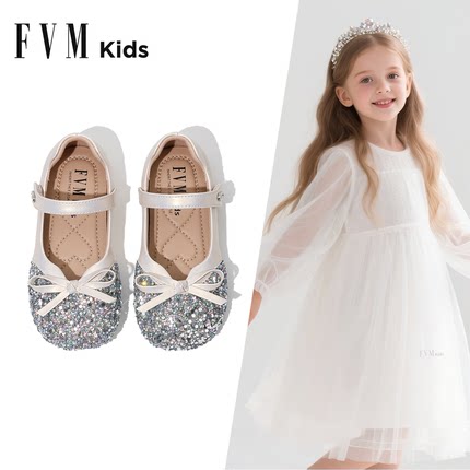 FVM女童鞋子儿童公主水晶小皮鞋2025秋新款艾莎女孩闪亮银色软底