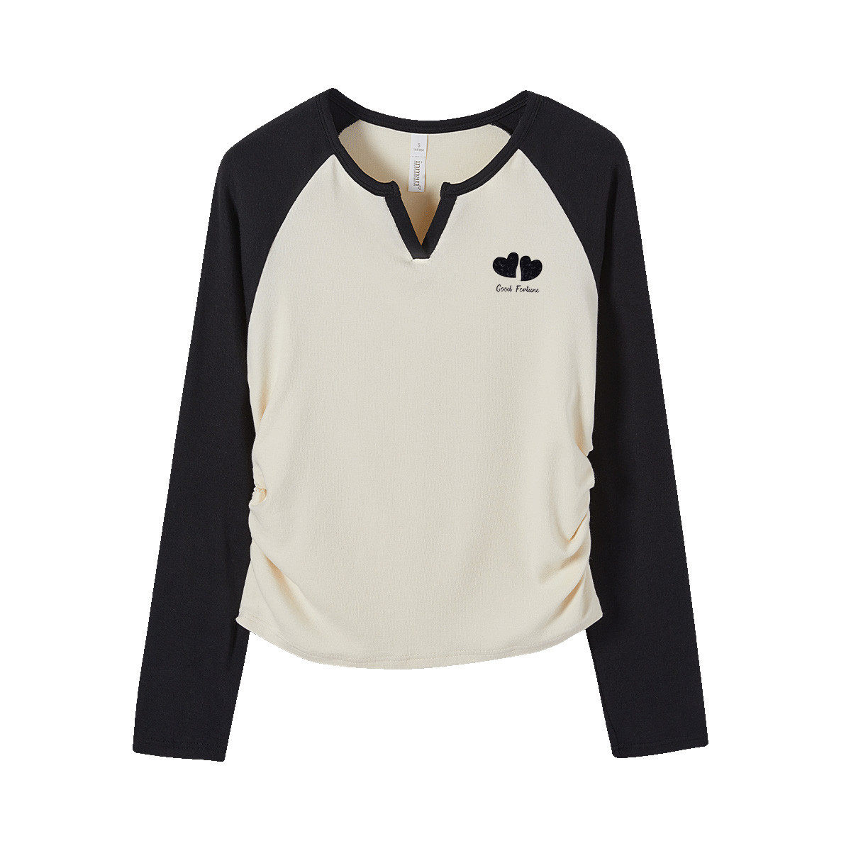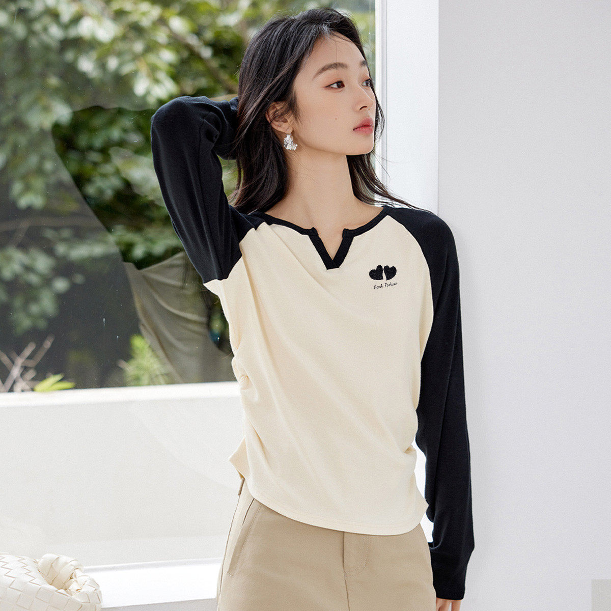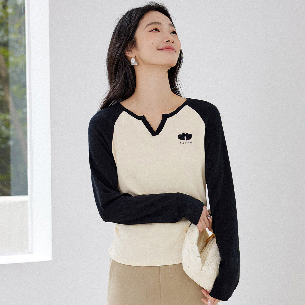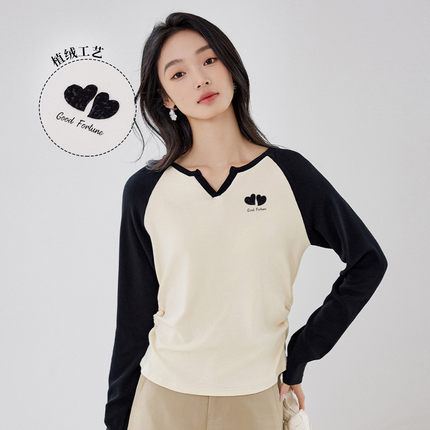 茵曼2026春季新款长袖t恤拼接撞色V领宽松显瘦修身上衣女士打底衫