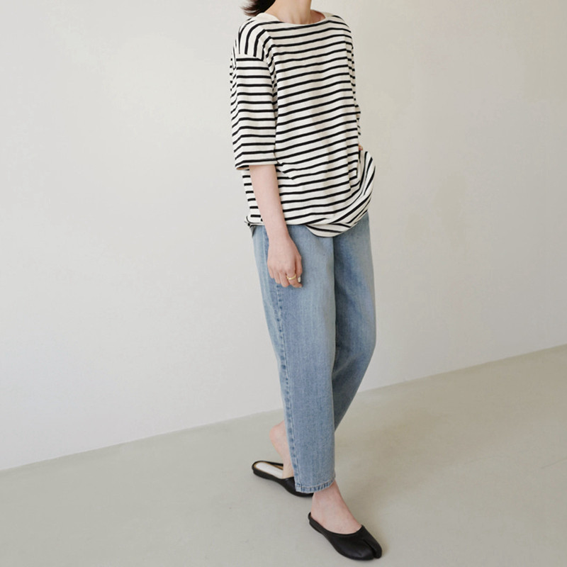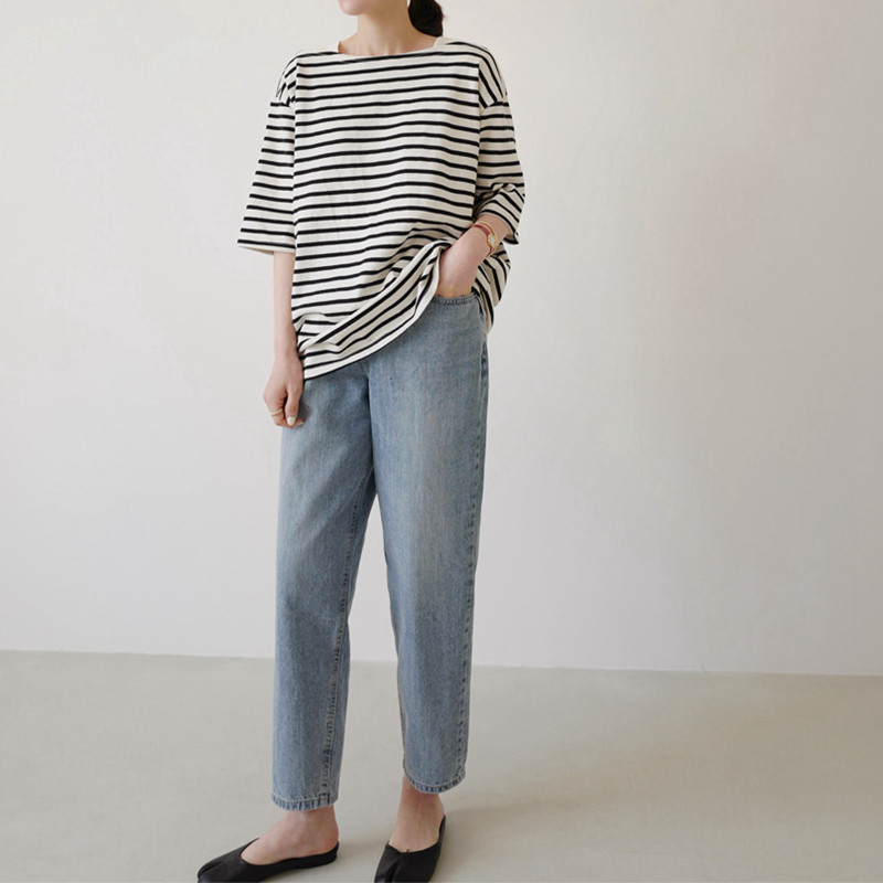 韩国女装新款宽松纯棉条纹短袖