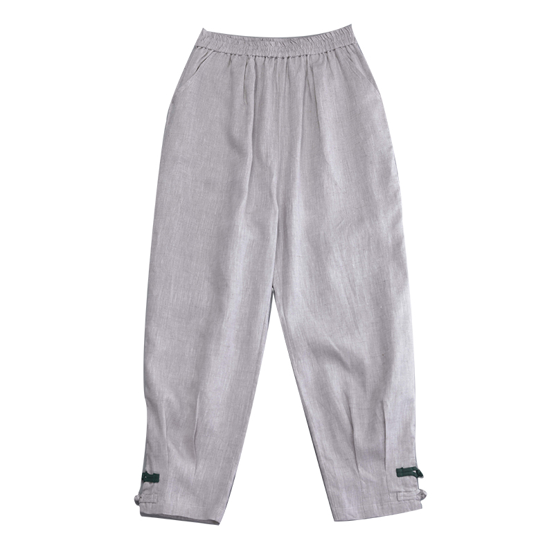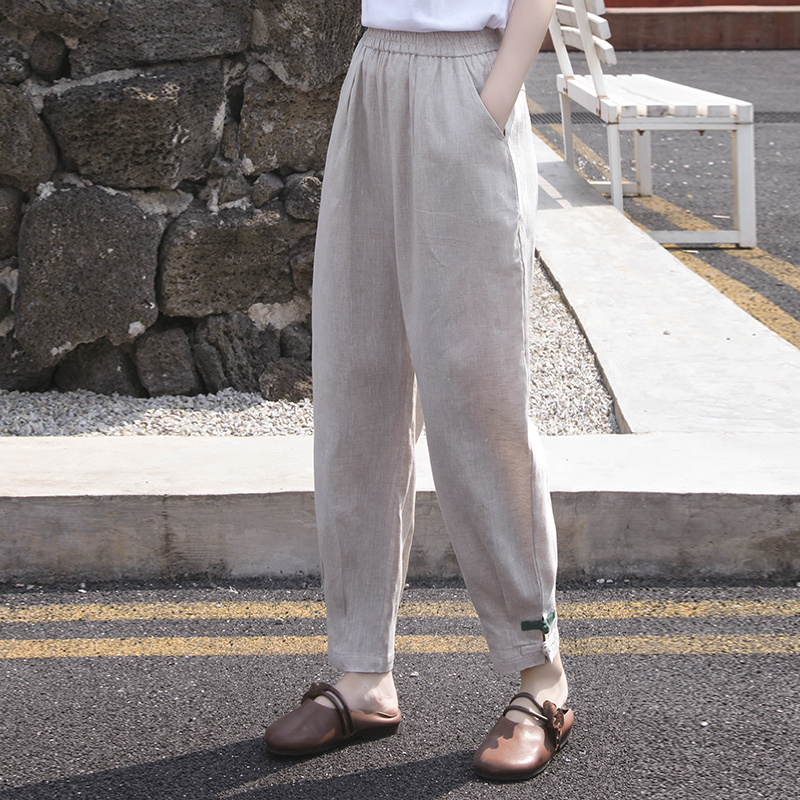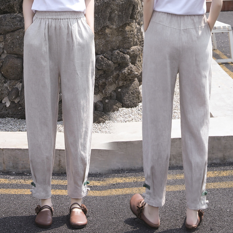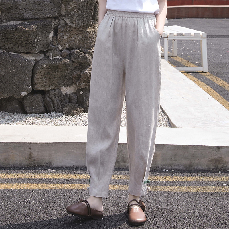 亚麻哈伦裤女2025夏季复古盘扣小脚萝卜裤休闲薄款棉麻九分裤子