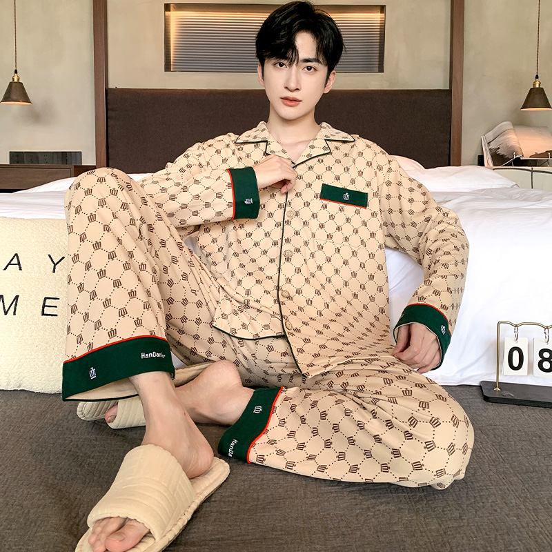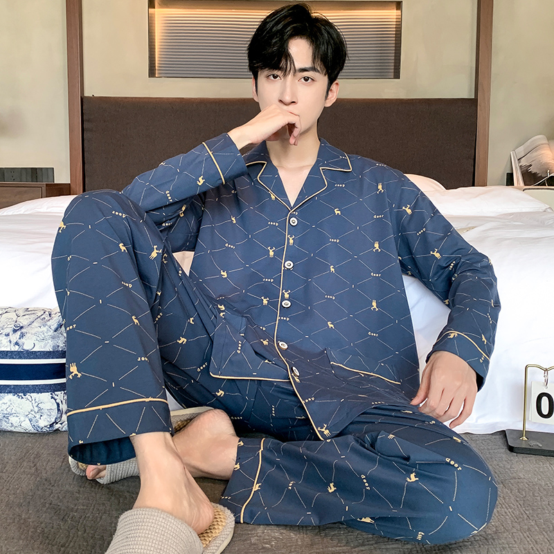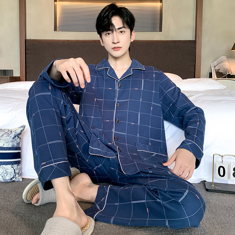 超大码睡衣男士纯棉长袖春秋季开衫青中年男款秋冬薄款家居服套装