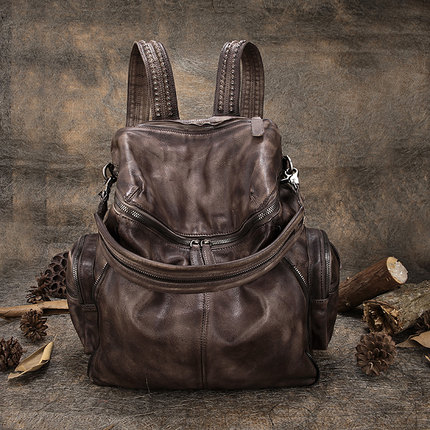 新款欧美复古头层牛皮双肩包女手工大容量真皮休闲铆钉旅行背包