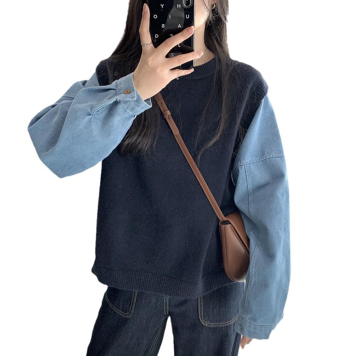 慵懒风灰色毛衣设计感假两件上衣女春秋2025新款牛仔袖拼接针织衫