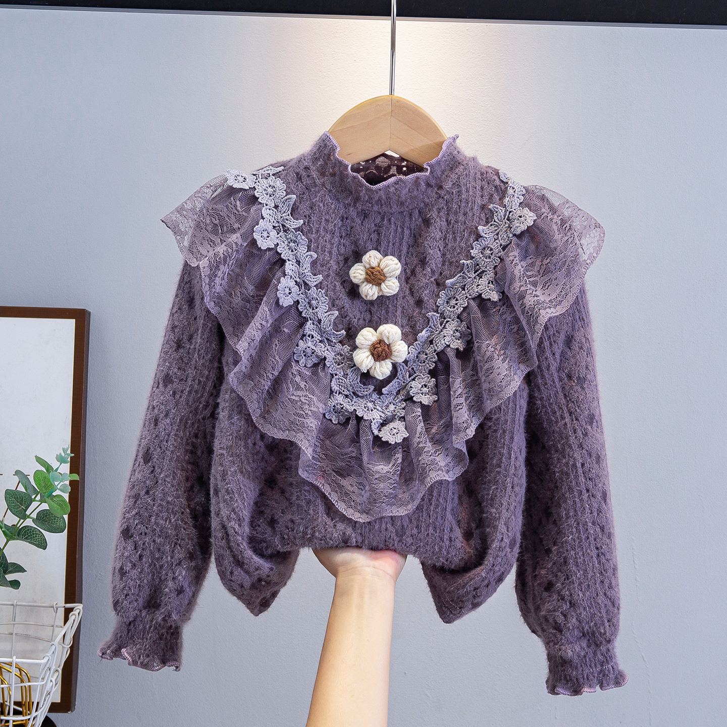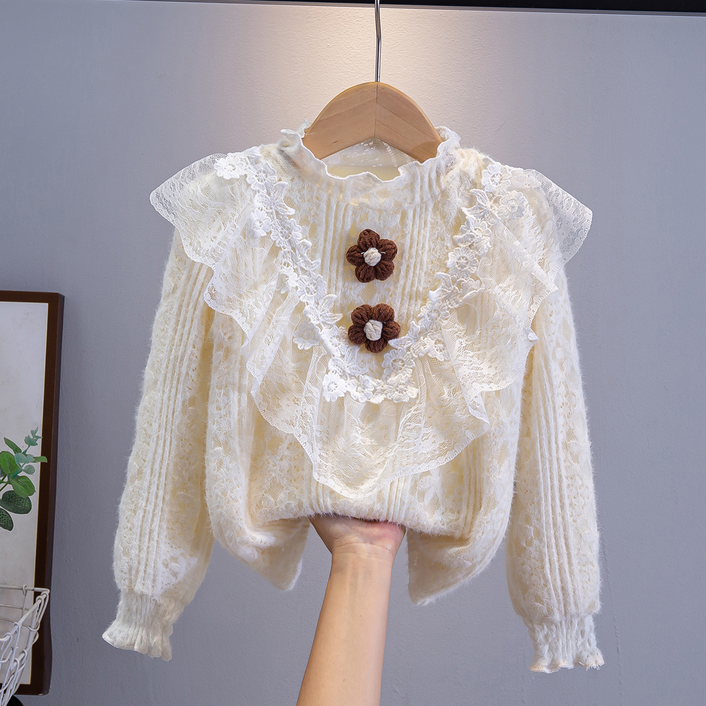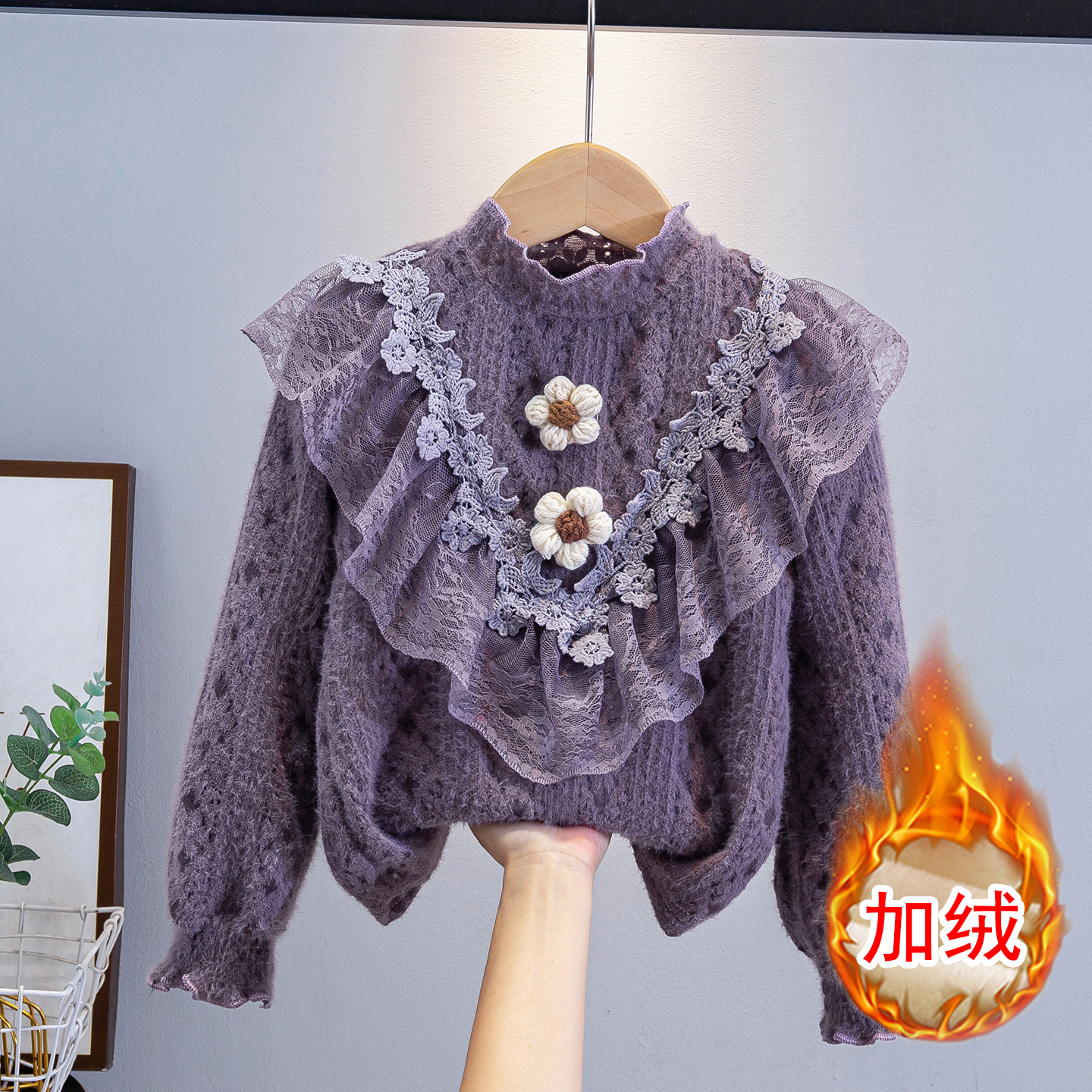女童加绒上衣春秋冬季新款儿童长袖蕾丝打底衫女孩针织衫保暖洋气