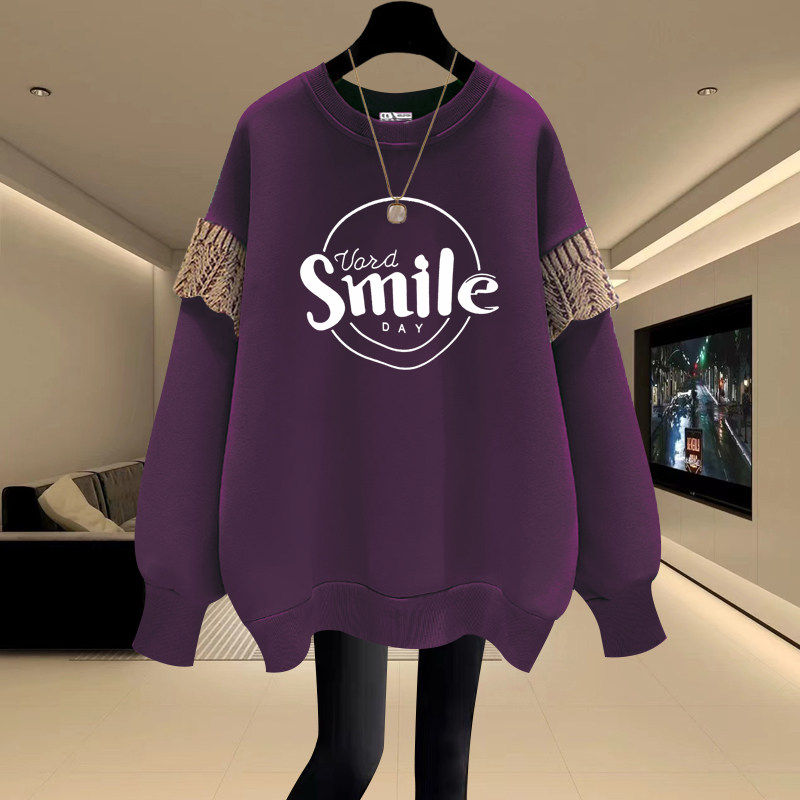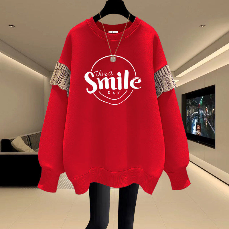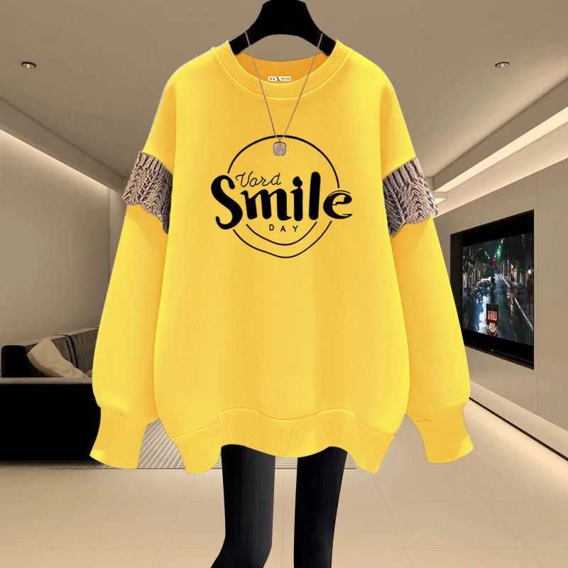 圆领卫衣女2025秋冬新款宽松韩版套头加绒加厚拼接中长款遮屁股潮