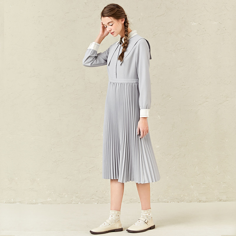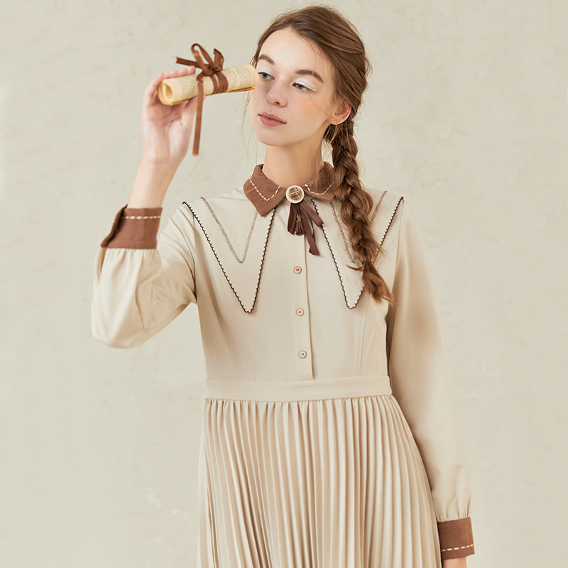 Famecoco折扣店气质双层领高腰显瘦衬衫裙压褶长袖连衣裙