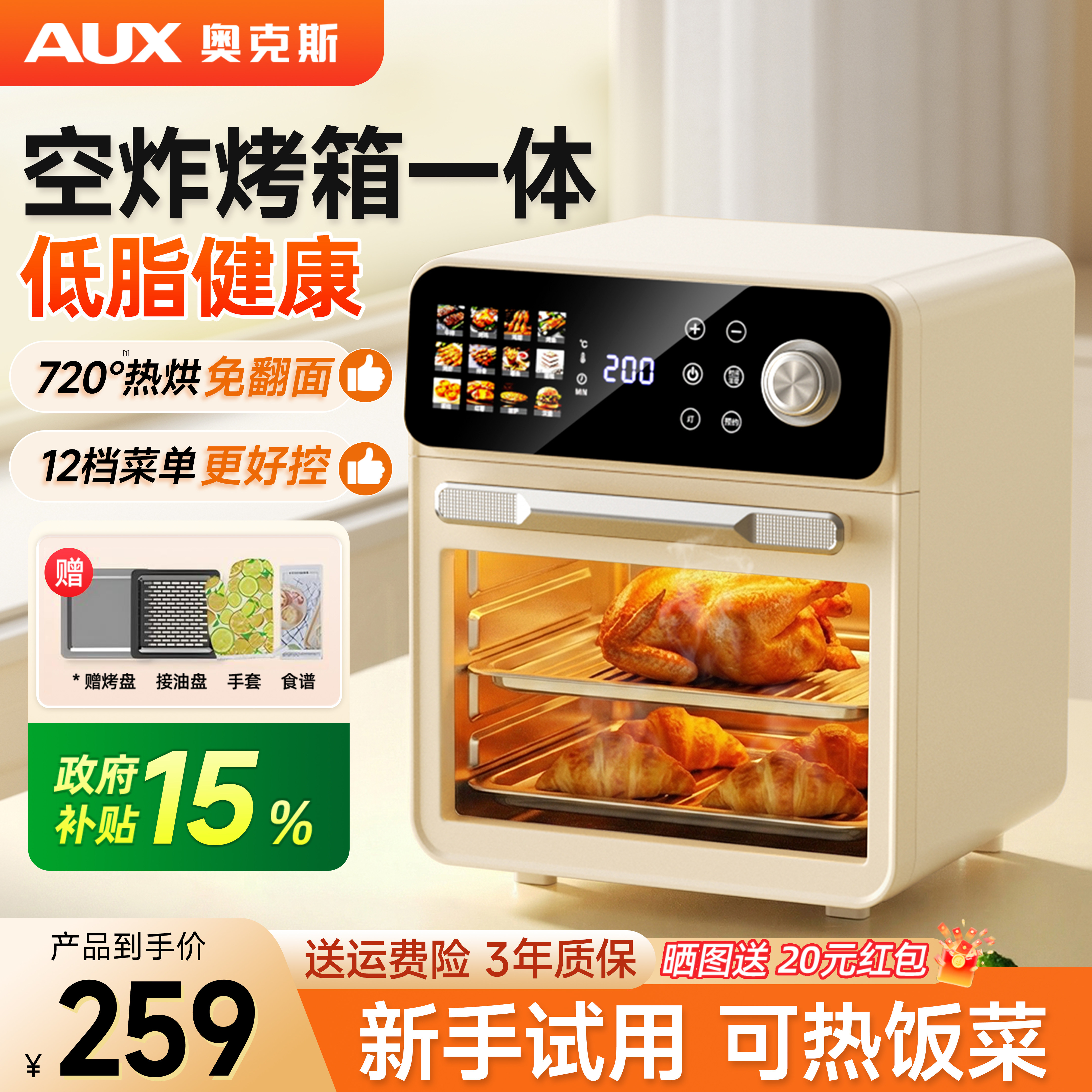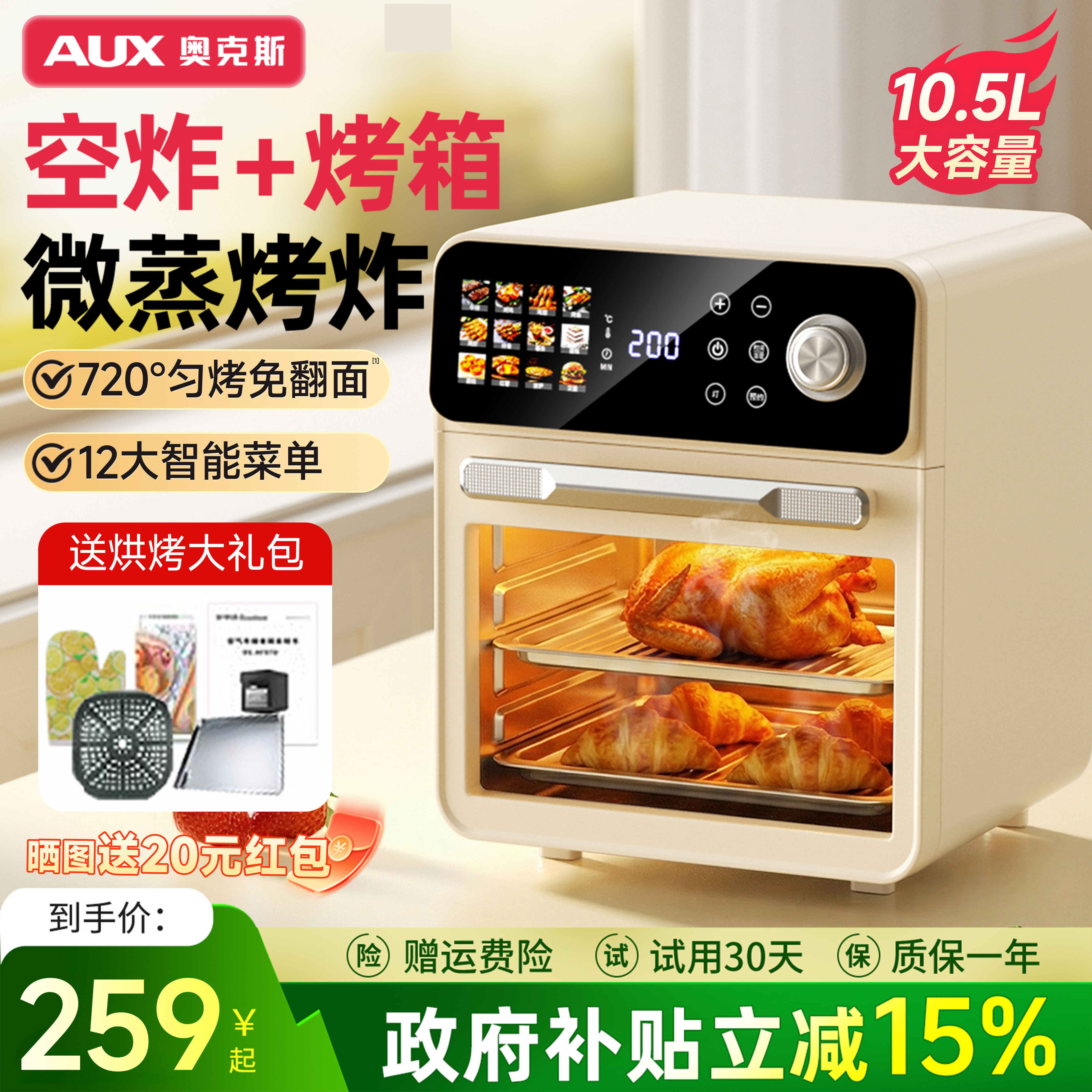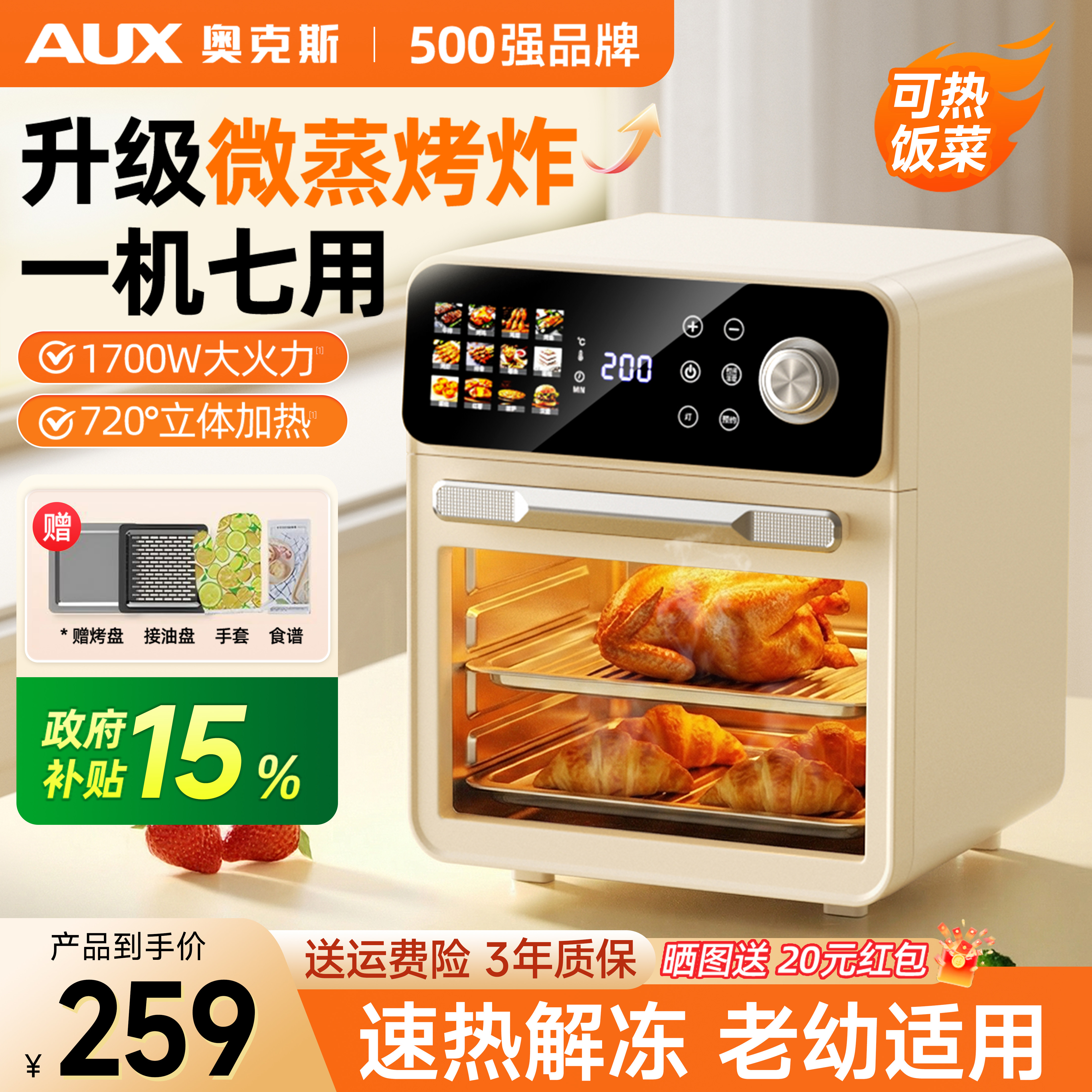 奥克斯空气炸烤箱微波炉三合一蒸烤一体机家用多功能小型烘焙专用