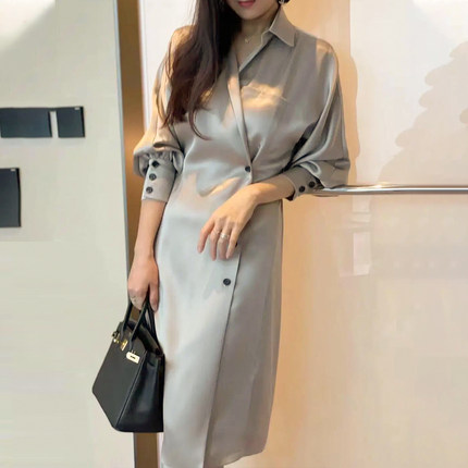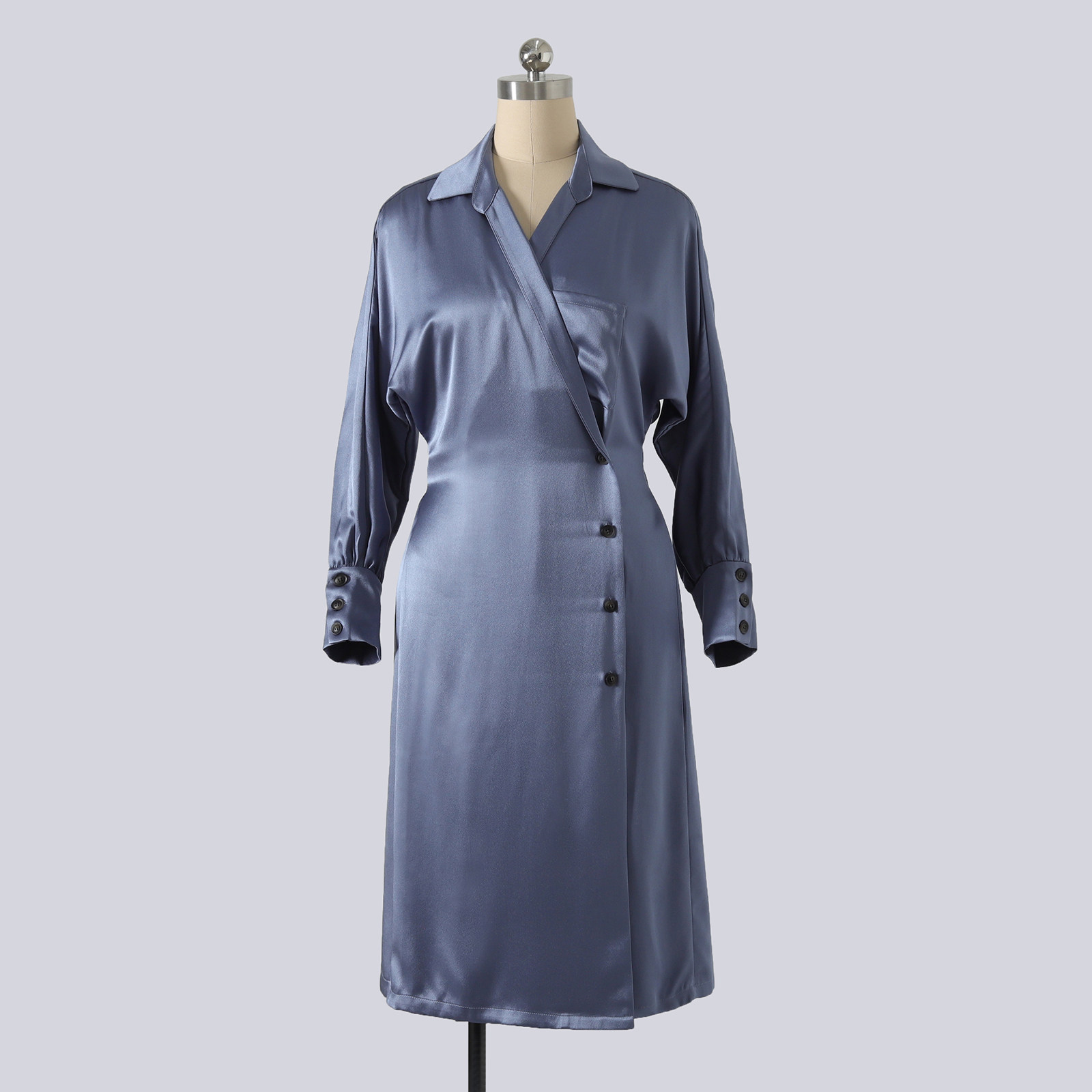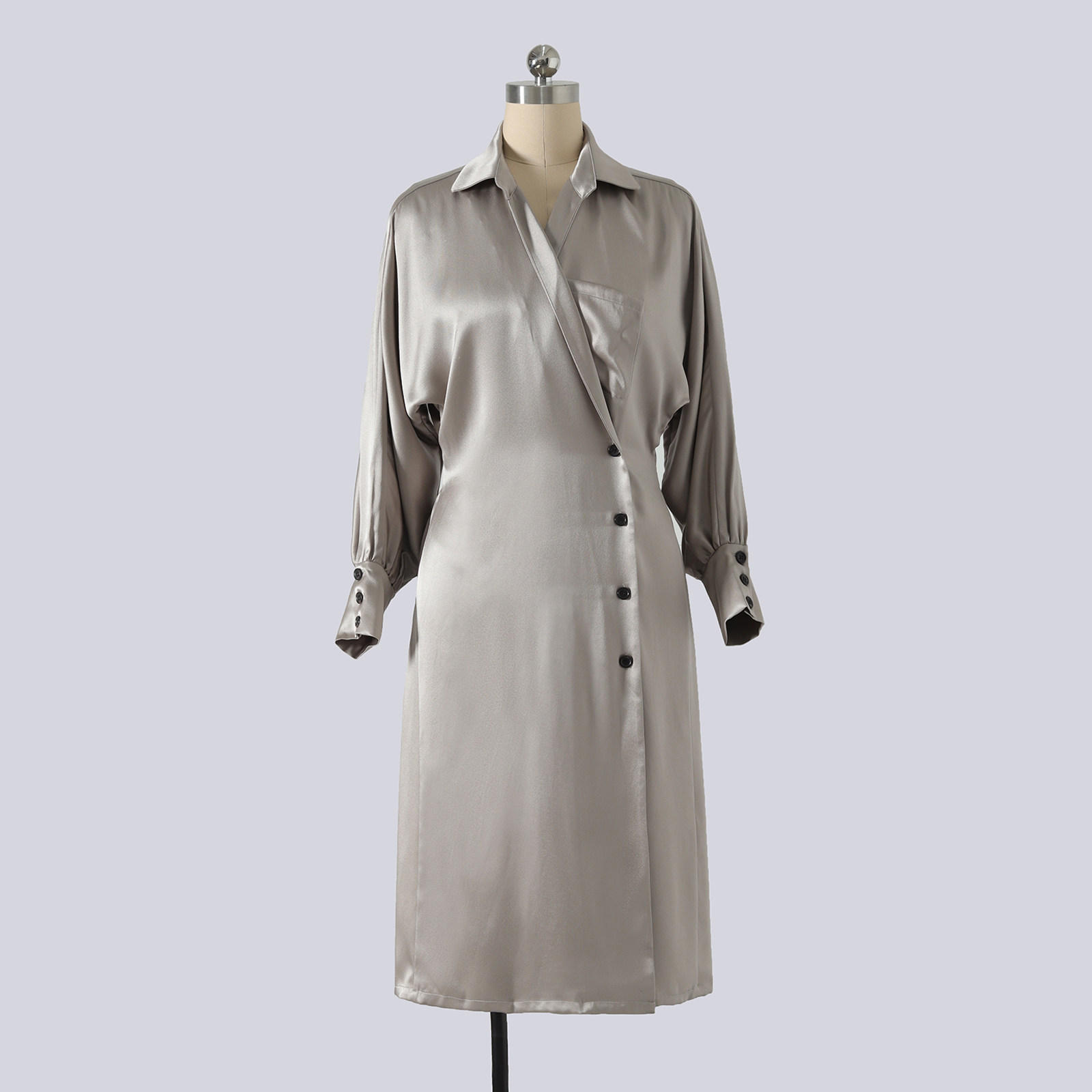 桑蚕丝甄品 50姆米重磅真丝双捻缎翻领不对称修身连衣裙 风衣外套