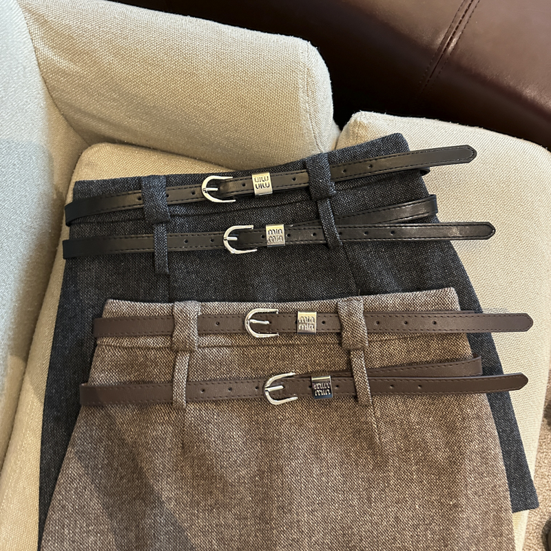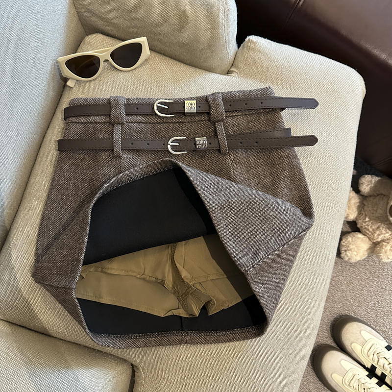 通勤 韩版简约纯色毛呢半身裙双腰带高腰包臀秋冬短裙女