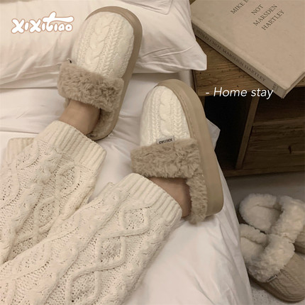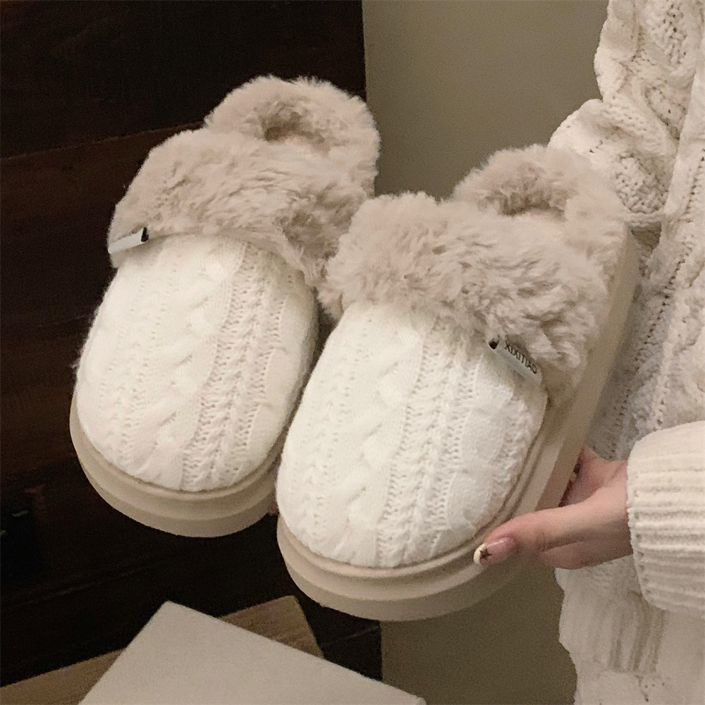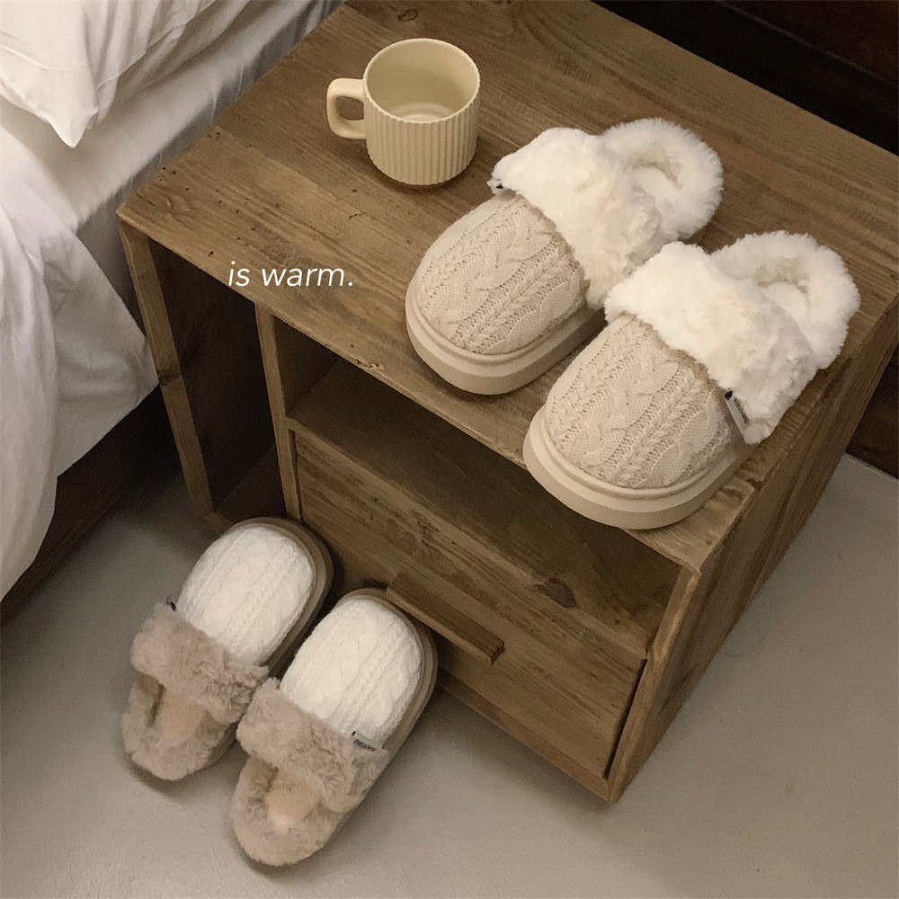 细细条 室内防滑保暖厚底女士居家月子鞋复古针织毛线麻花棉拖鞋