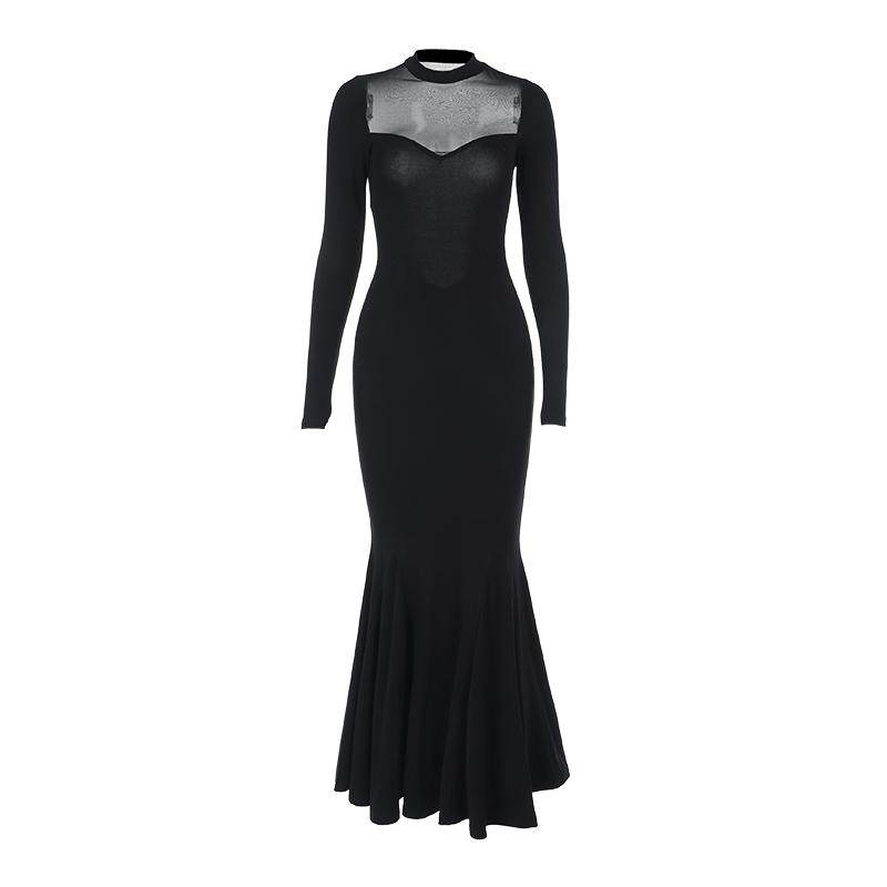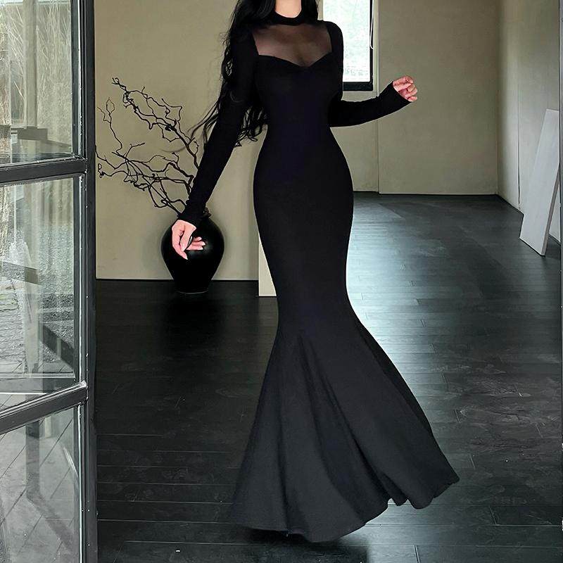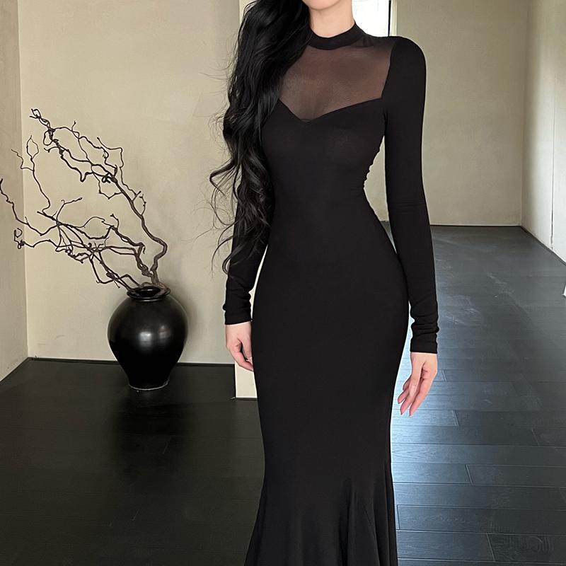 instunning纯欲性感网纱拼接长袖连衣裙女高级感腰气质高鱼尾裙子